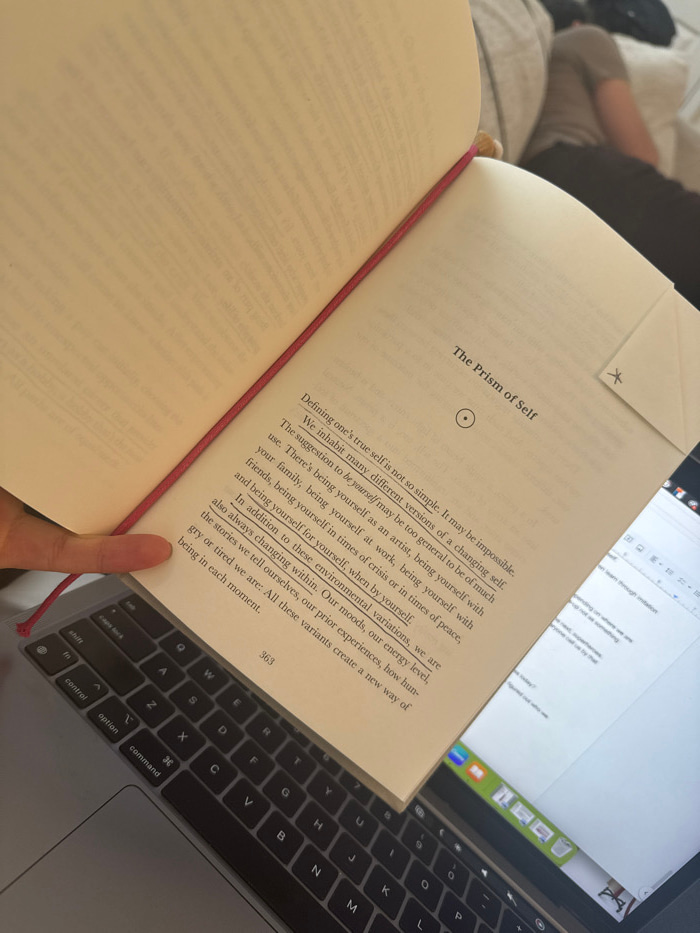 An indoor scene within the city of New York, United States of America, depicts a personal space. A fair-skinned hand, primarily the thumb and forefinger, holds an open book over a laptop keyboard. Theβ¦read more