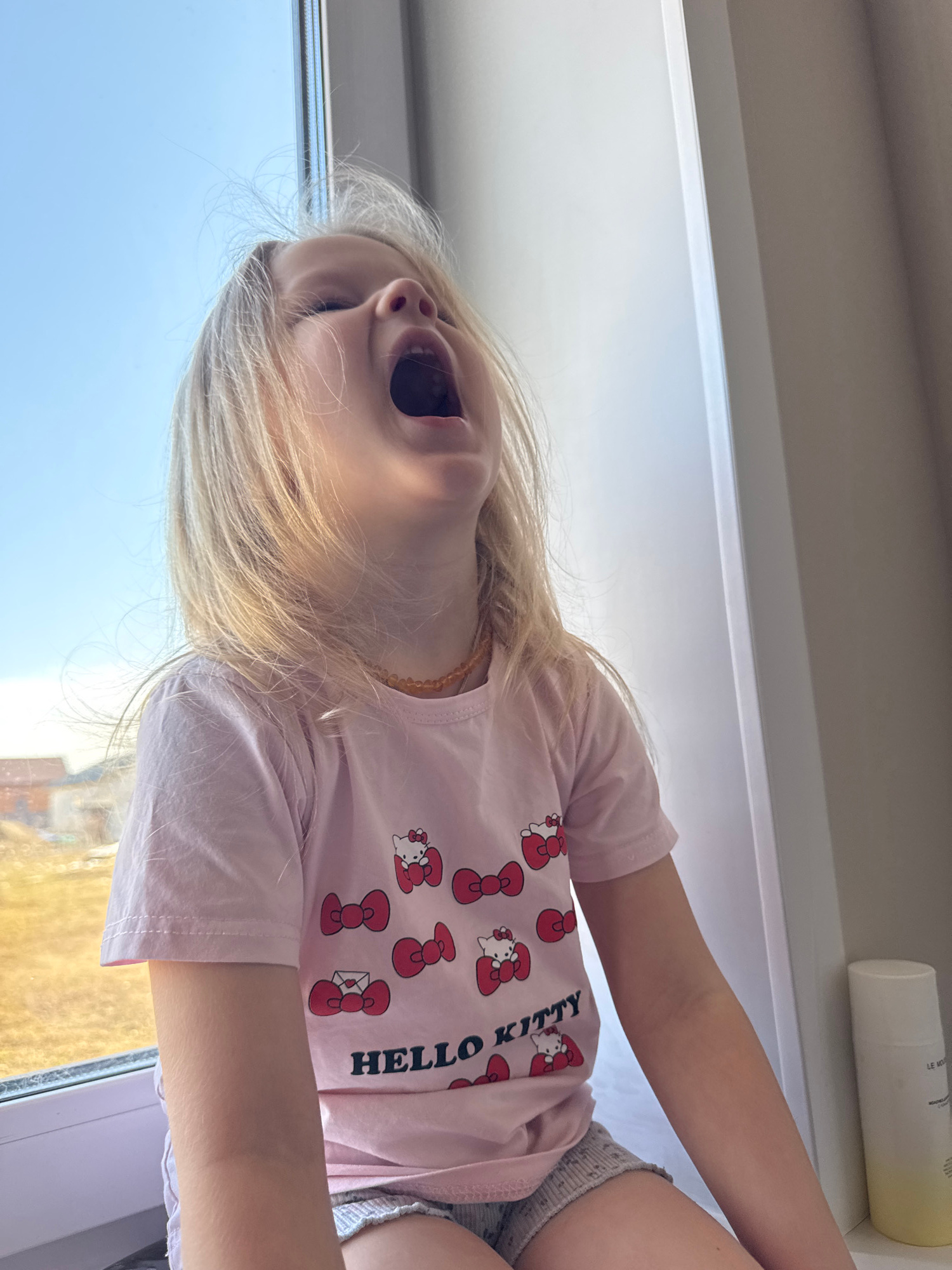 A young child with blonde hair, wearing a pink Hello Kitty t-shirt and grey shorts, is positioned in front of a window. The child's mouth is open. The view outside the window is blurred, suggesting a…read more