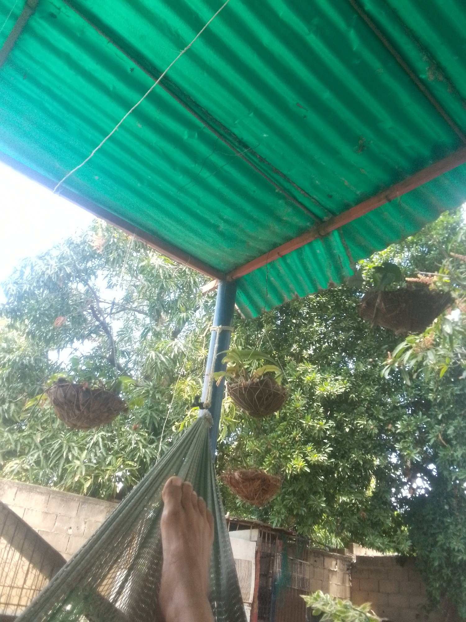 The image shows a partial view from a hammock, likely located in an outdoor area. A person's bare foot is visible in the lower portion of the hammock. The hammock is suspended beneath a corrugated gre…read more