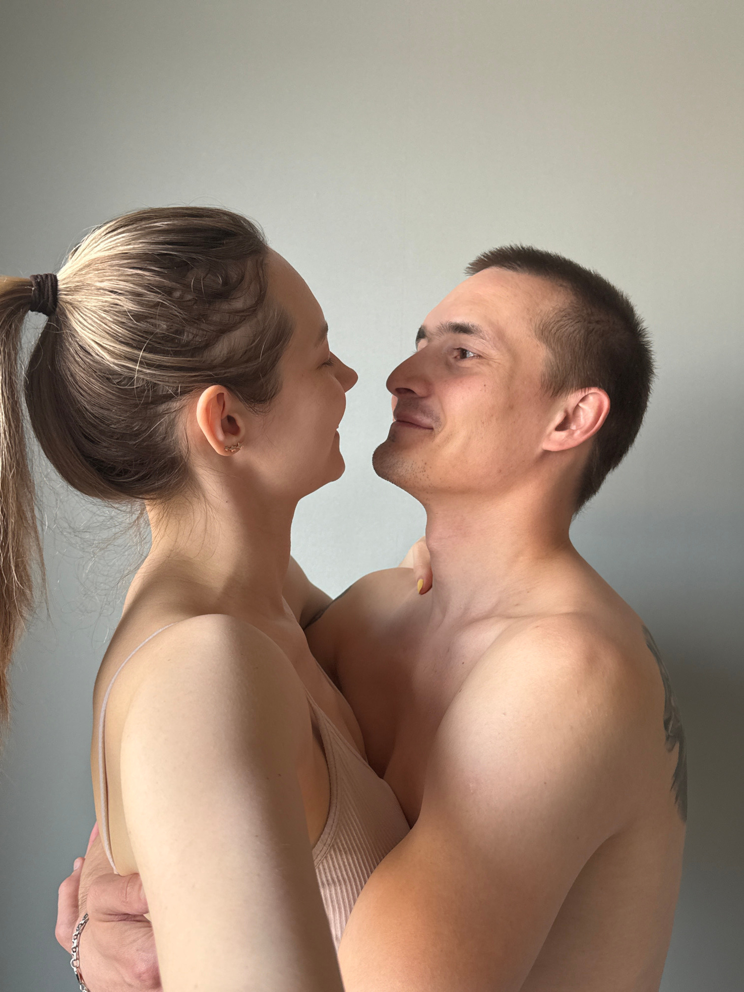 A man and woman are depicted in a close, intimate pose. The man, who is shirtless, has short dark hair and a tattoo on his shoulder. He looks down at the woman with a slight smile. The woman, wearing…read more