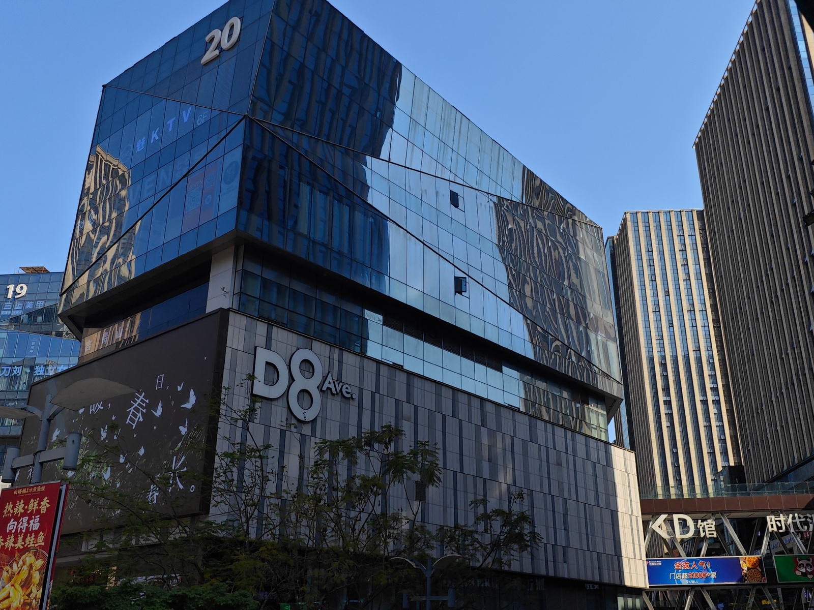 This image depicts a bustling urban scene in Yuzhong District, China, characterized by modern architecture under a clear blue sky. The central focus is a large, multi-story commercial building with an…read more