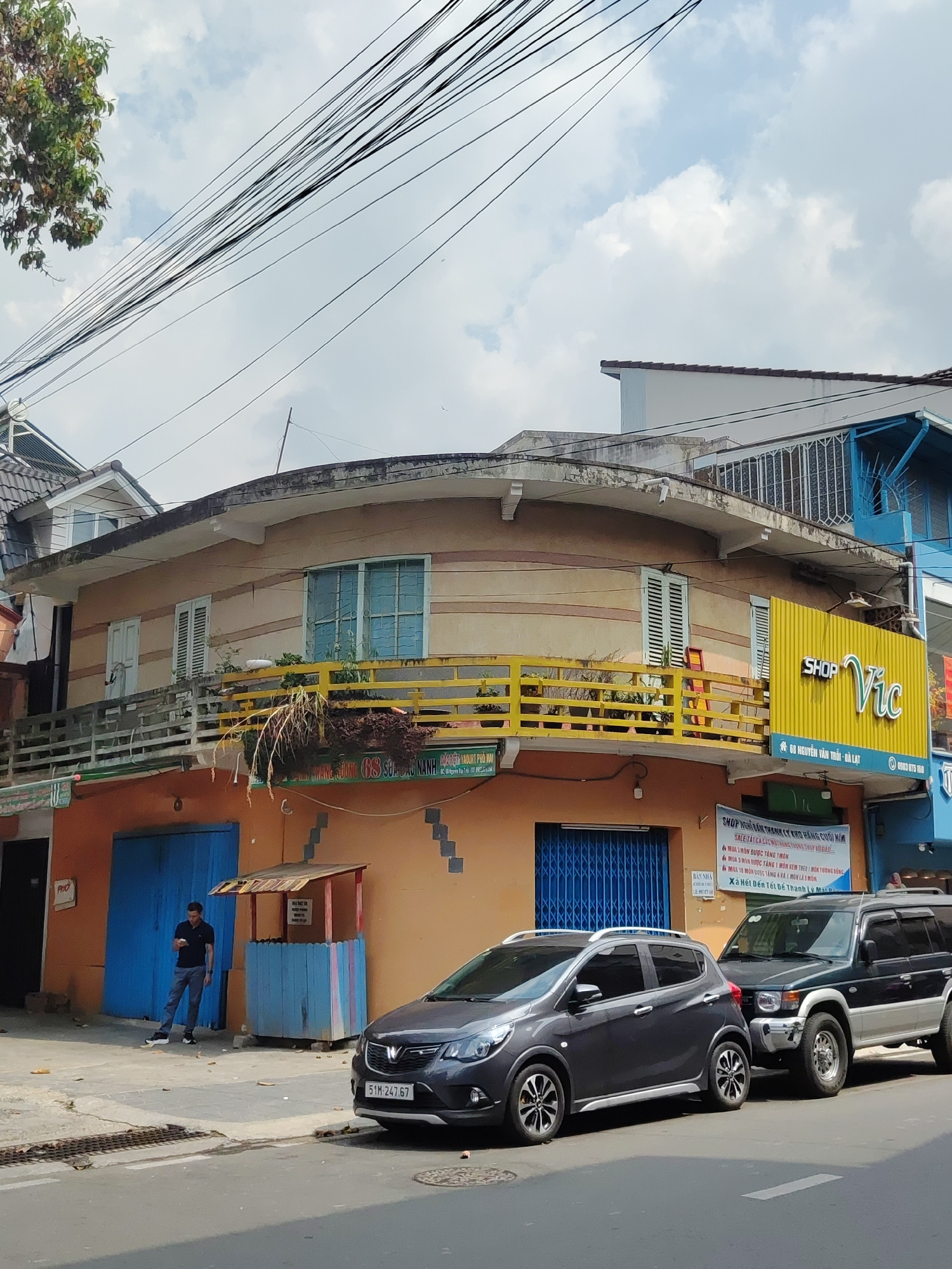The image shows a street scene in Da Lat, Vietnam. A two-story building with a rounded upper section and a yellow balcony is the focal point. The building houses a shop named "Shop Vic" located at 68…read more