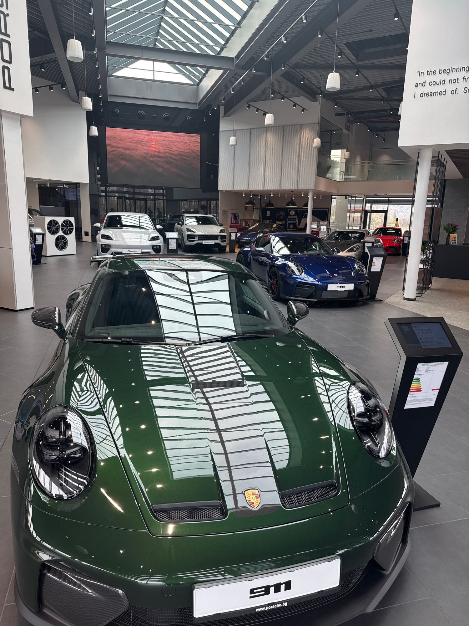 The image shows the interior of a Porsche dealership, likely located in Pancharevo, Bulgaria, as indicated by the URL "www.porsche.bg" visible on the car. The foreground features a green Porsche 911 w…read more