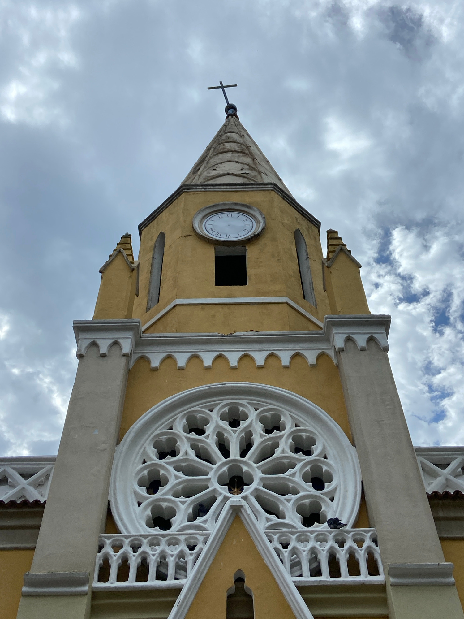 The image shows a low-angle upward view of the tower of the Iglesia Nuestra Señora del Carmen in San José de Barlovento, Venezuela. The tower is painted yellow and has white trim. The spire is topped…read more