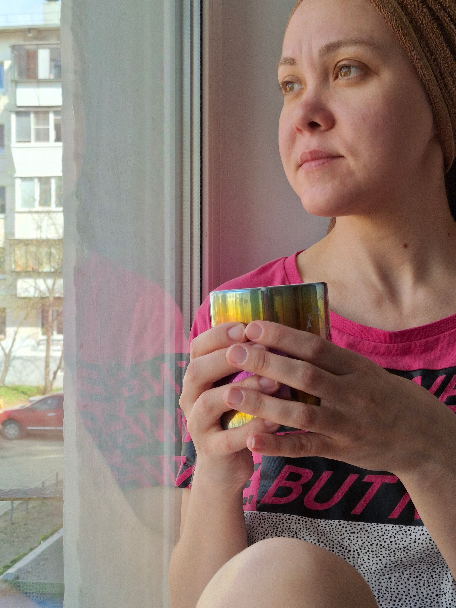An eye-level, rotated shot captures a light-skinned person, appearing female, leaning forward indoors, looking towards the camera with a neutral to slightly contemplative expression. They have warm br…read more