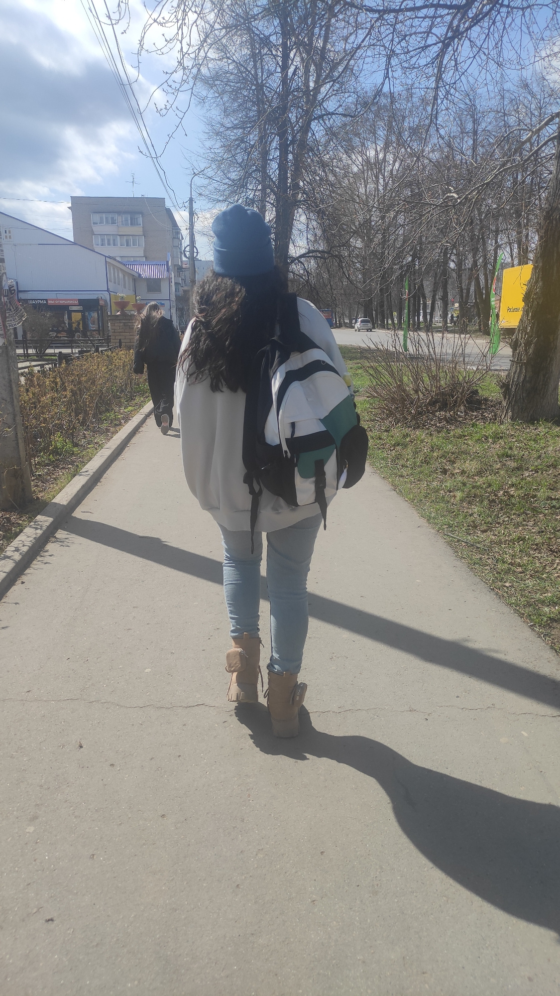 The image captures an outdoor scene in Chaikovsky, Russia, showing a person walking away from the camera on a paved sidewalk. The person is wearing light-wash blue jeans, brown lace-up boots, a white…read more