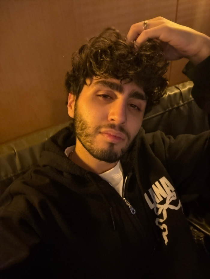 A forensic description of the scene reveals a young adult male, seated indoors in Yerevan, Armenia. The individual possesses a light-to-medium skin tone, dark curly hair, and a dark beard and mustache. He wears a black zip-up hoodie over a white undershirt, with a silver-colored chain visible beneath the shirt collar. A partial logo, possibly "LANAI" with a coiled snake graphic, is present on the right sleeve of the hoodie. His right hand is raised, with fingers interacting with his hair, and a ring is visible on his right ring finger. He maintains direct eye contact with the camera. The background consists of a plain, light brown wall or paneling on the left, and a darker, less defined area on the right, suggesting an upholstered backrest or similar structure. The lighting is dim and warm, illuminating the subject from the front-left. | Open Wire