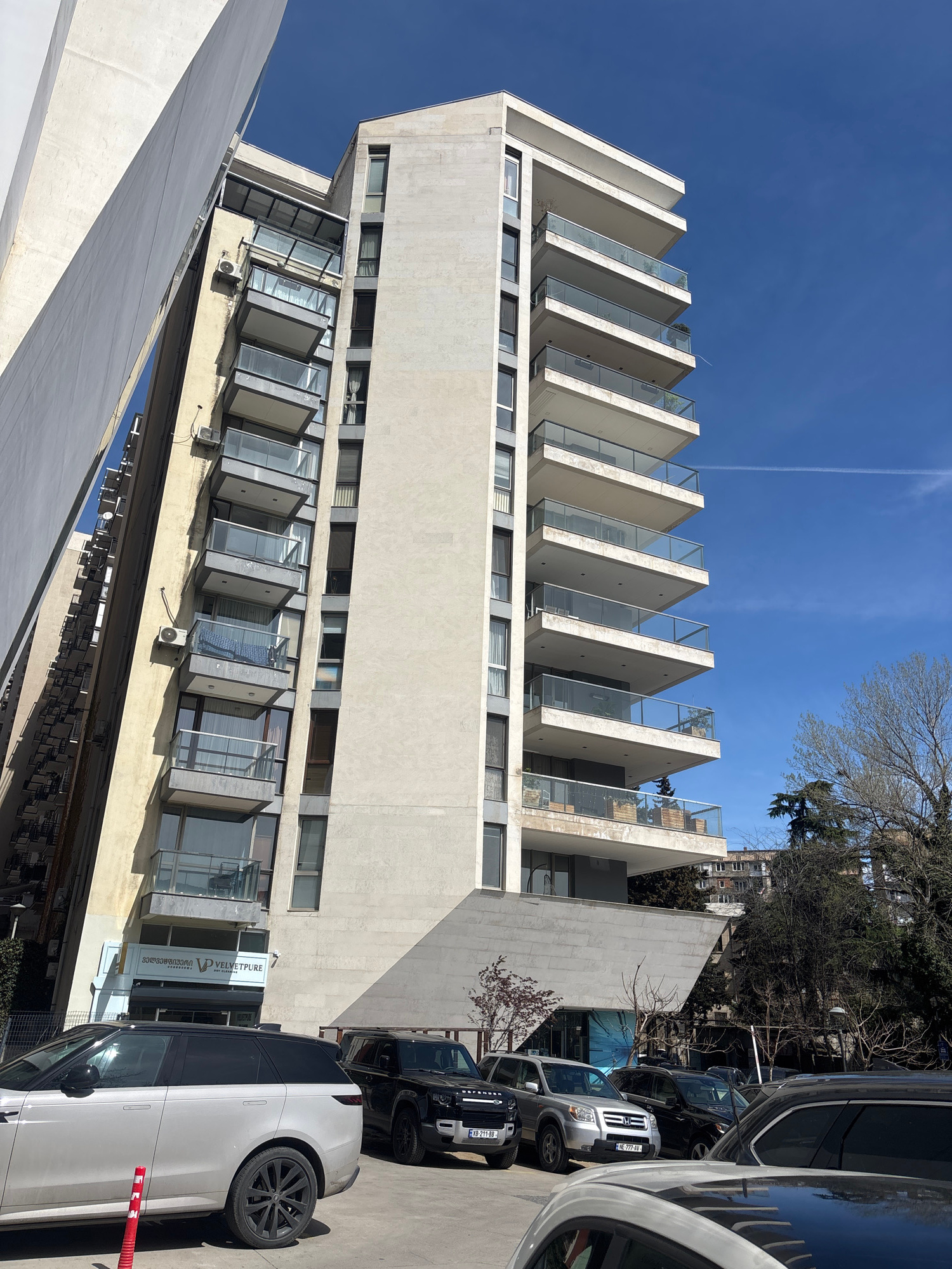 The image captures a tall, modern building with a distinctive architectural design, featuring projecting balconies with glass railings. The building is likely a residential or commercial structure. Thβ¦read more
