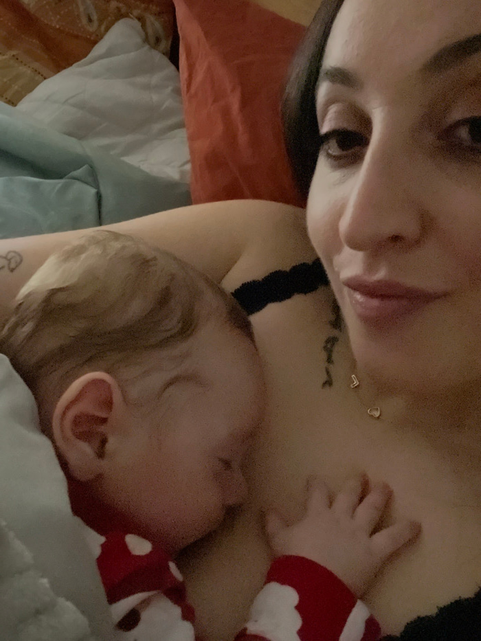 A mother and child rest together in bed. The mother's face is close to the camera, angled downward towards the sleeping baby nestled against her chest. The baby, wearing a red and white cloud patterne…read more