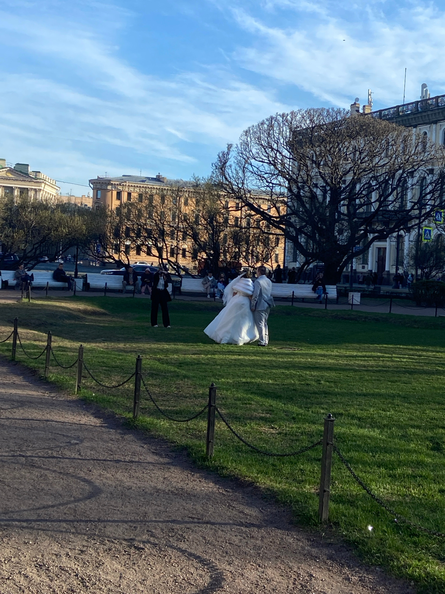 The image depicts a couple, presumably a bride and groom, in a park-like setting in Saint Petersburg, Russia. The bride is wearing a white wedding dress, and the groom is wearing a gray suit. They are…read more
