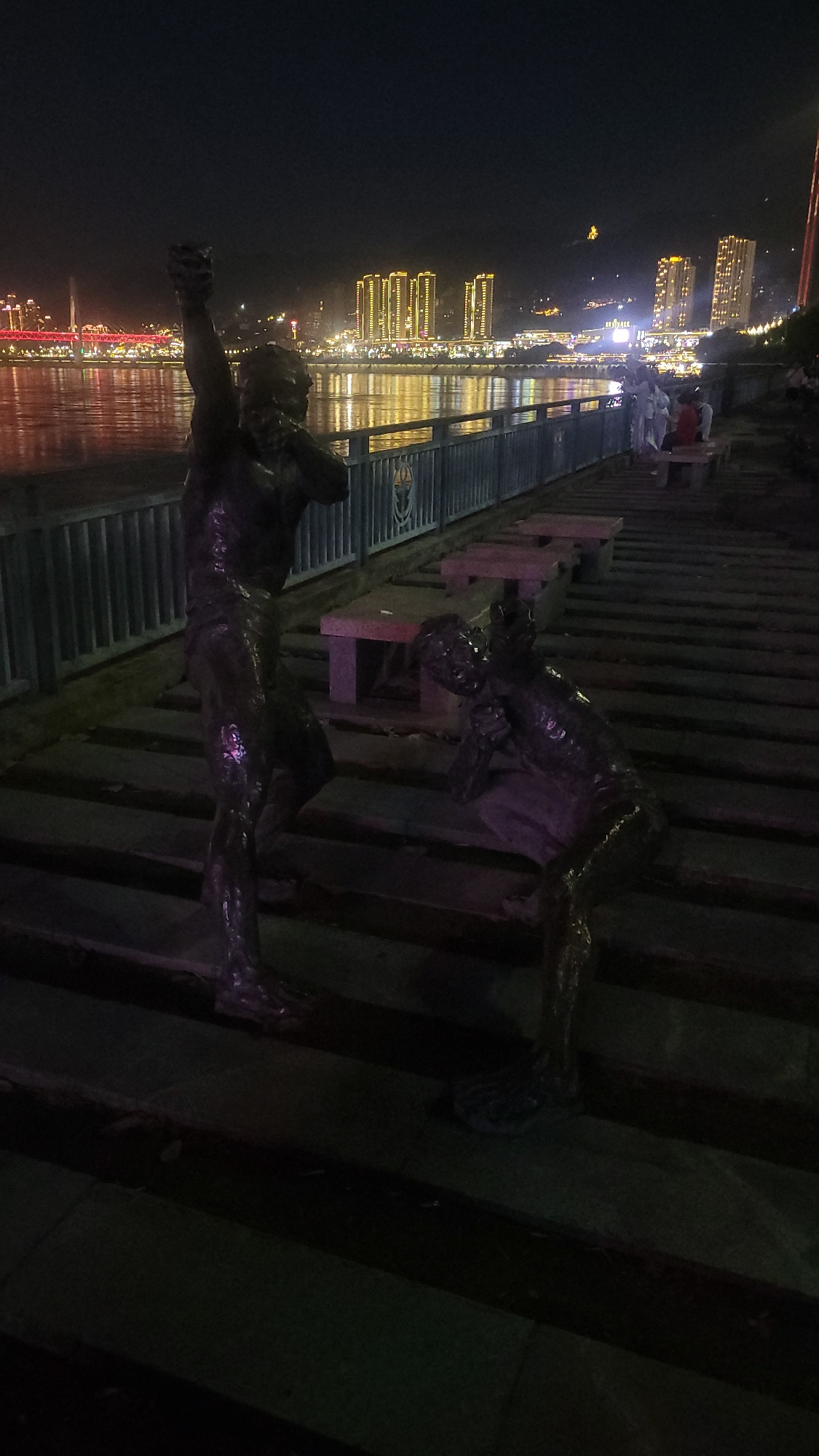 At night in Nan'an District, China, two bronze statues stand on a walkway along a body of water. The statue in the foreground shows a man raising his fist in the air, while the statue in the backgroun…read more