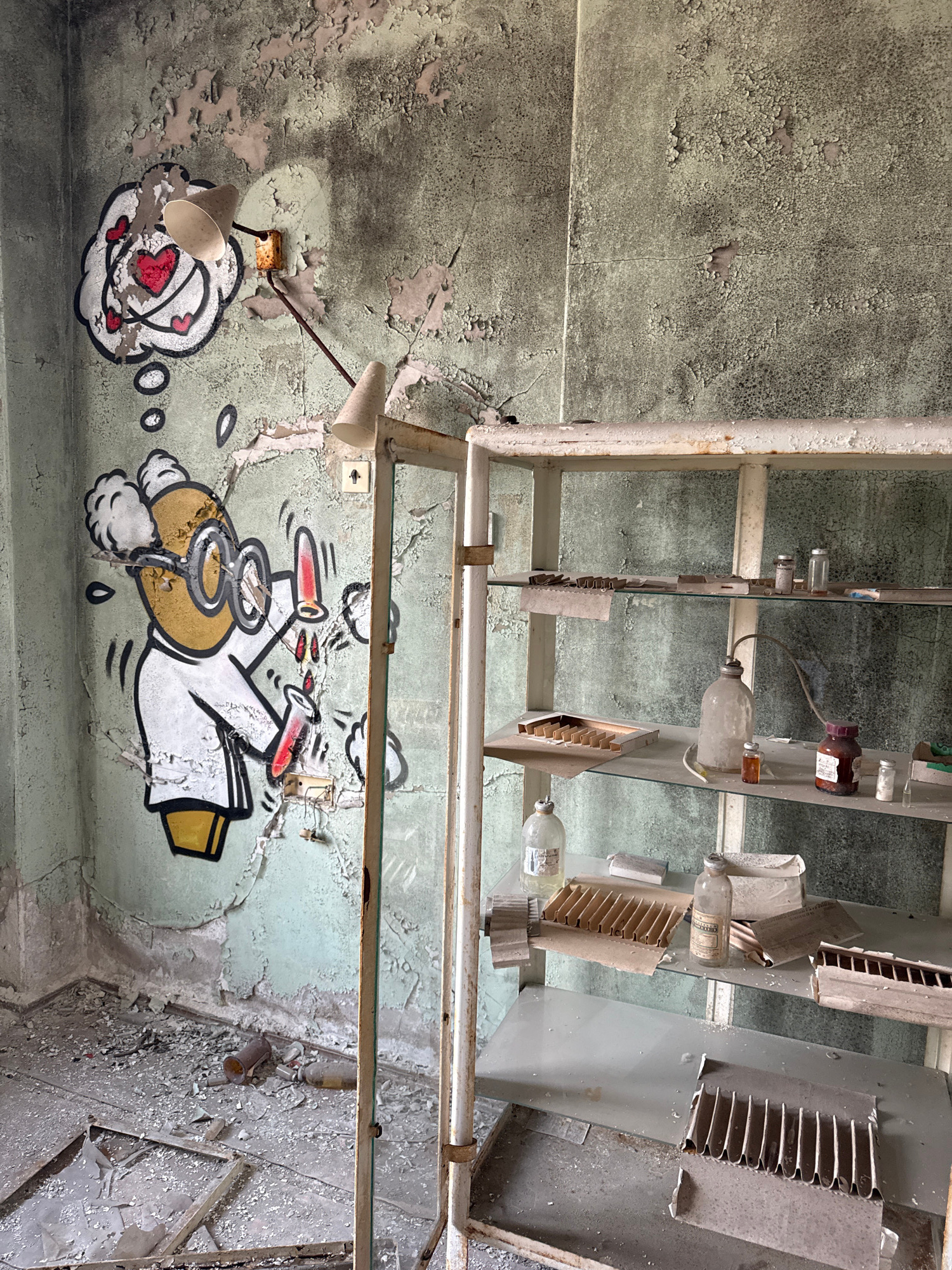 The image captures a view looking upwards in a dilapidated interior, potentially within the city of Prypiat, Ukraine. The ceiling is heavily damaged, with peeling paint and cracks. Two distinct graffi…read more