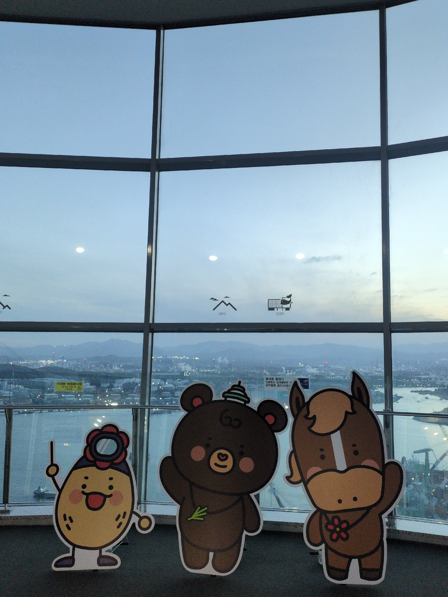 This image captures a vibrant interior space with a panoramic view of an urban and industrial landscape at dusk or early evening, likely from an observation deck in Ulsan, South Korea. Three cheerful…read more