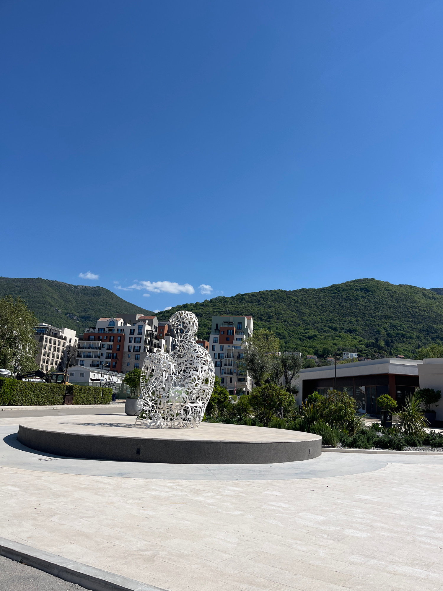 The image displays a vibrant outdoor scene in Tivat, Montenegro, under a clear blue sky. A prominent white sculpture, intricately formed from numerous interwoven letter-like shapes, occupies the foreg…read more