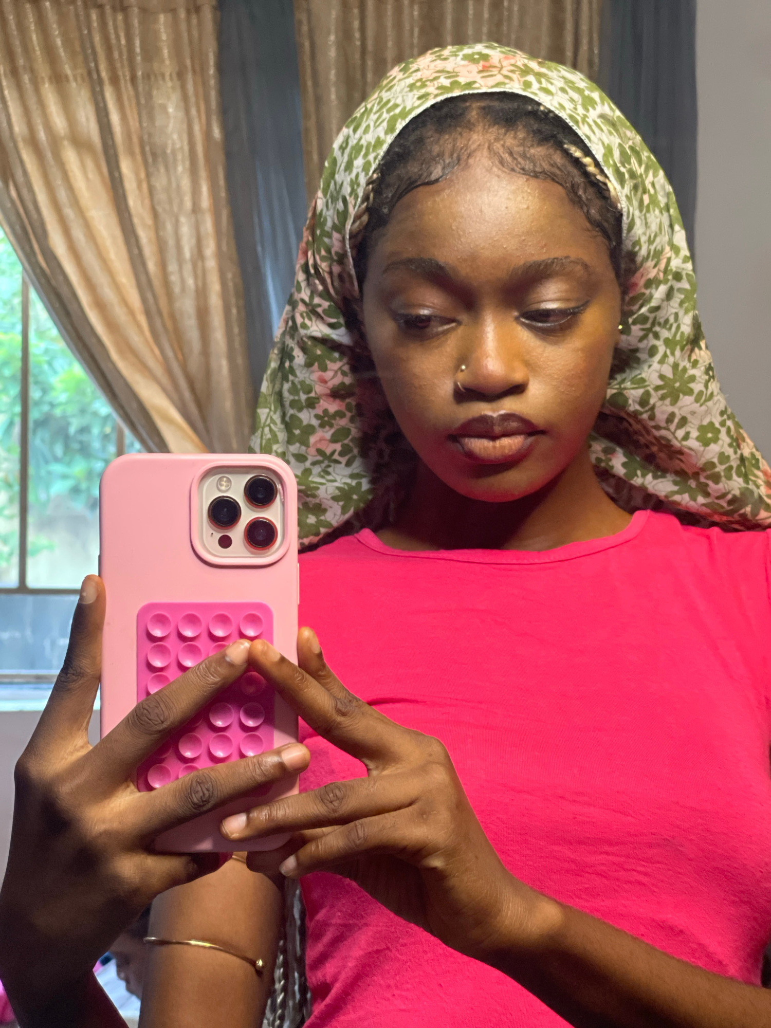 The image is a close-up selfie of a young Black woman taken indoors in Ado, Nigeria. She is positioned with her head slightly tilted, looking directly at the smartphone she holds with both hands to ca…read more