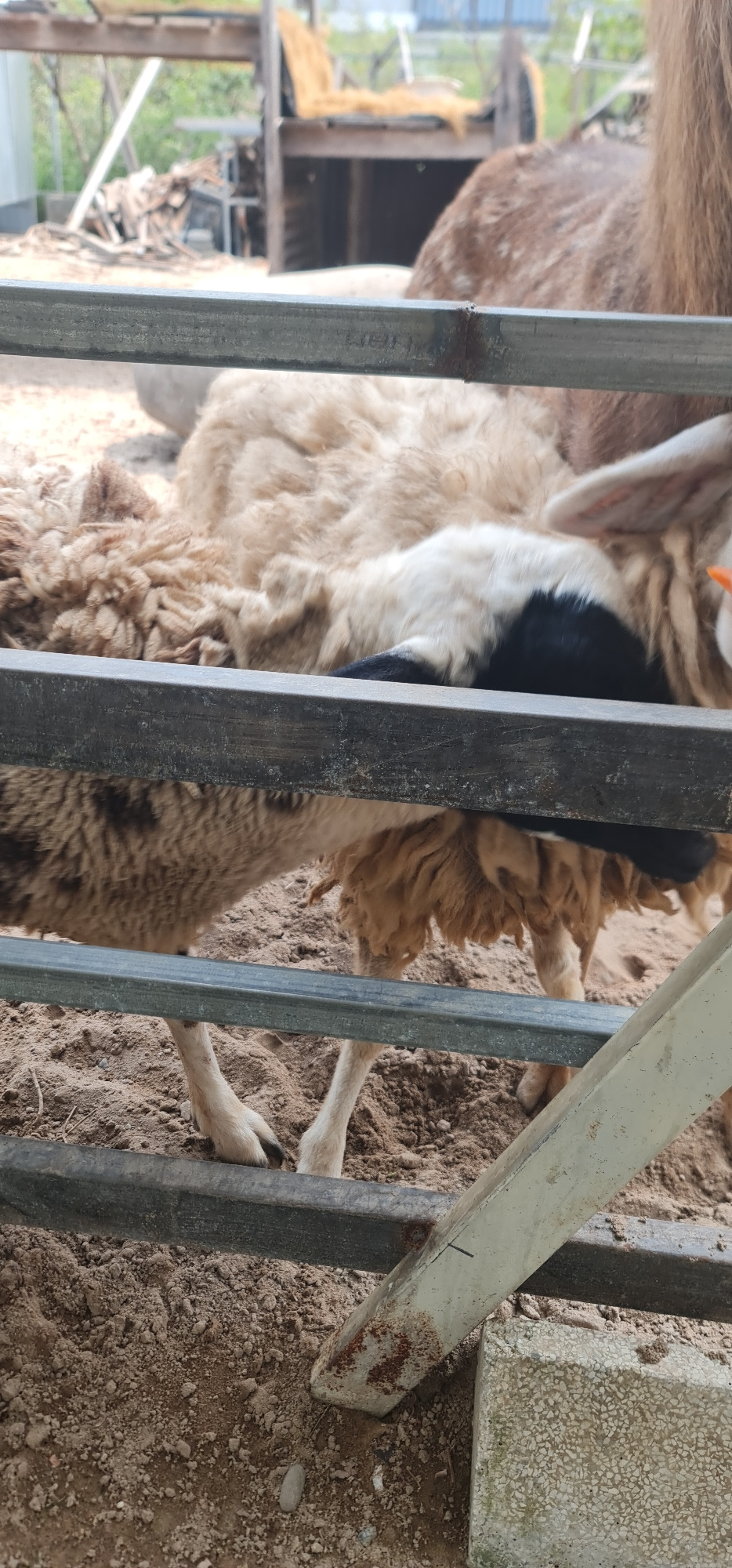 The image depicts an animal, likely a sheep or a goat, seen through the metal bars of an enclosure. The animal in the foreground has thick, light brown, curly fleece with prominent black and white mar…read more