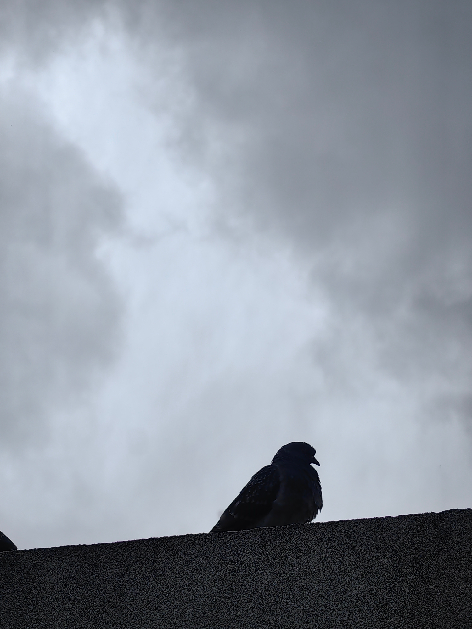 A medium shot captures a dark pigeon perched on a grainy gray surface. The sky behind it is overcast with large, pale gray clouds. The pigeon is the darkest element in the composition, positioned appr…read more