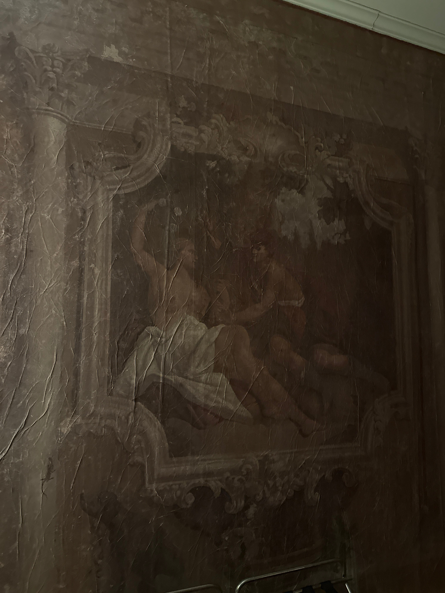A faded, heavily cracked mural adorns a wall. The mural is framed with ornate details and depicts figures, possibly classical or allegorical in nature, with draped clothing. The dark colors and age-re…read more