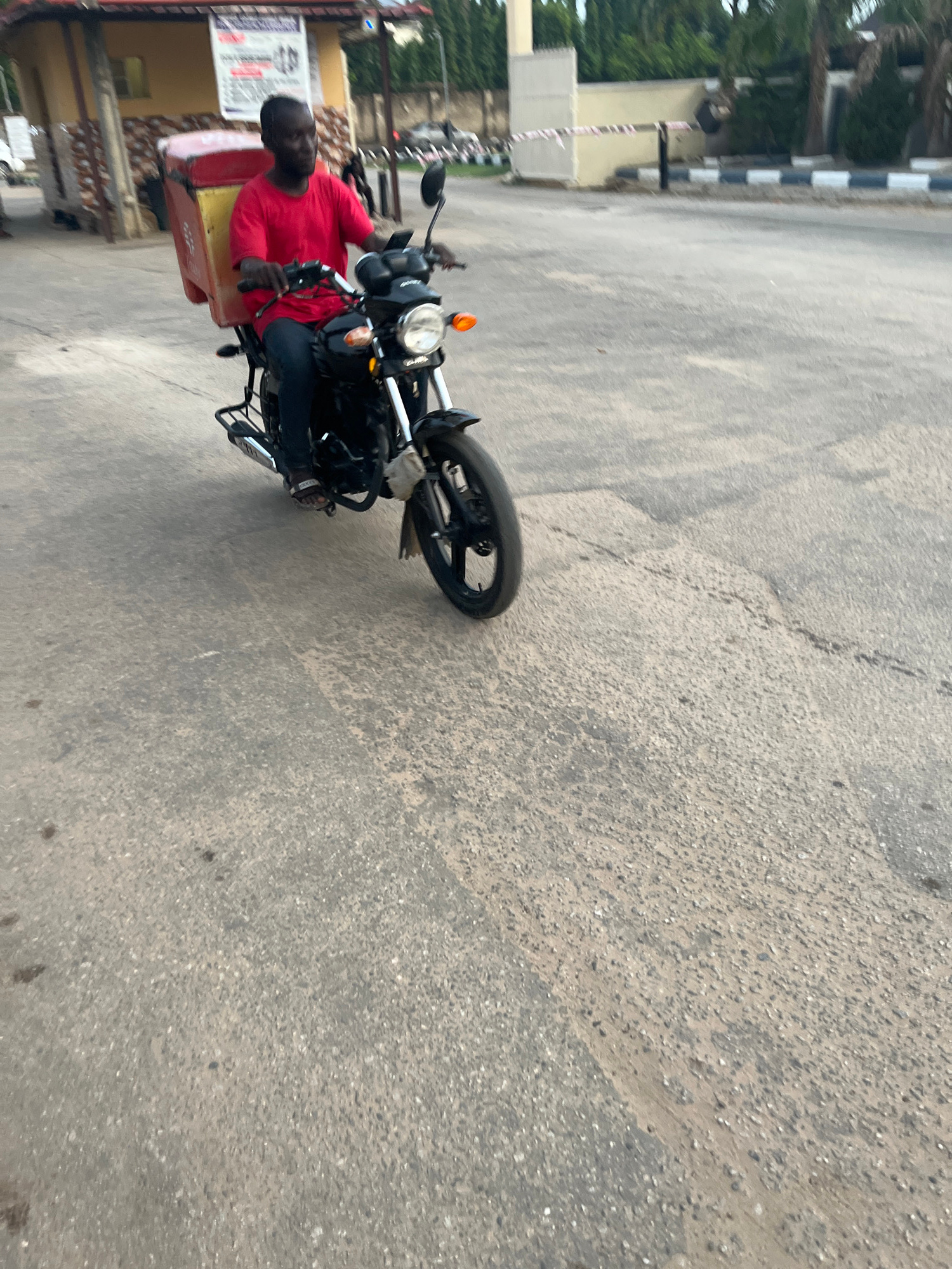 A man in a red shirt rides a black motorcycle with a red box attached to the back on an asphalt road. The location appears to be in a city, possibly Abuja, Nigeria, based on the architecture and road…read more