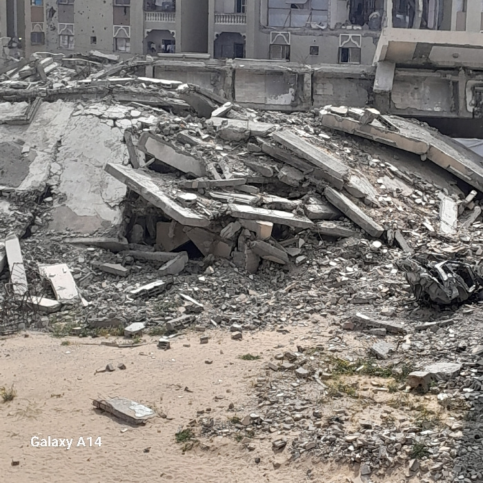 This image depicts a scene of extensive urban destruction in Khan Yunis, Palestinian Territory. The foreground consists of light-brown sandy ground sparsely covered with small grey debris and patches…read more