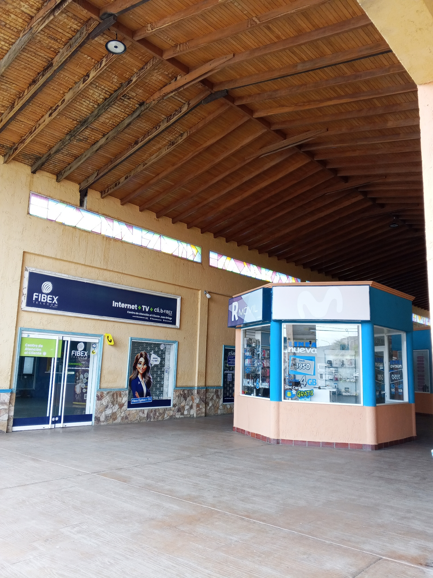 The image captures an outdoor commercial space, likely a shopping arcade, in Juan Griego, Venezuela. The scene is dominated by two storefronts. On the left, a FIBEX Telecom store features a prominent…read more