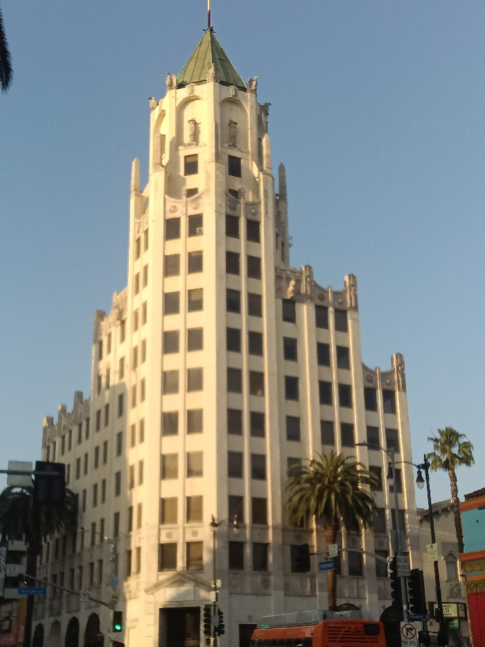 The image depicts the Eastern Columbia Building, located at 849 S Broadway, Los Angeles, California, United States. The prominent subject is a tall, cream-colored Art Deco building featuring multiple…read more