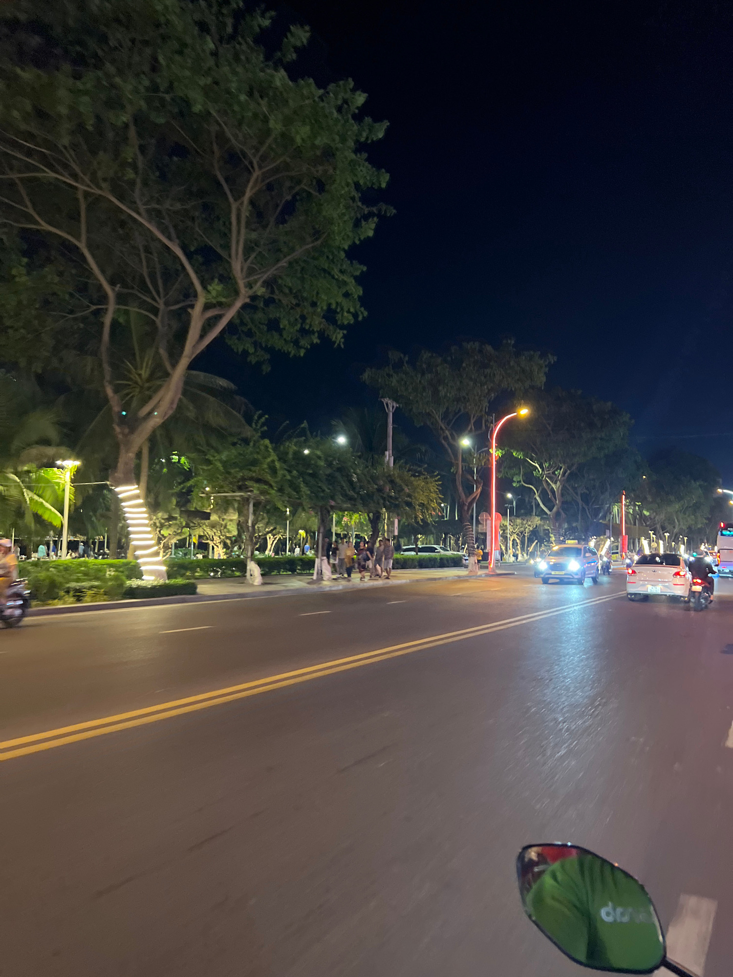 The image depicts a nighttime scene on a road in Nha Trang, Vietnam. The view is from the perspective of someone riding a motorcycle, evident from the side mirror in the top right corner. The road is…read more