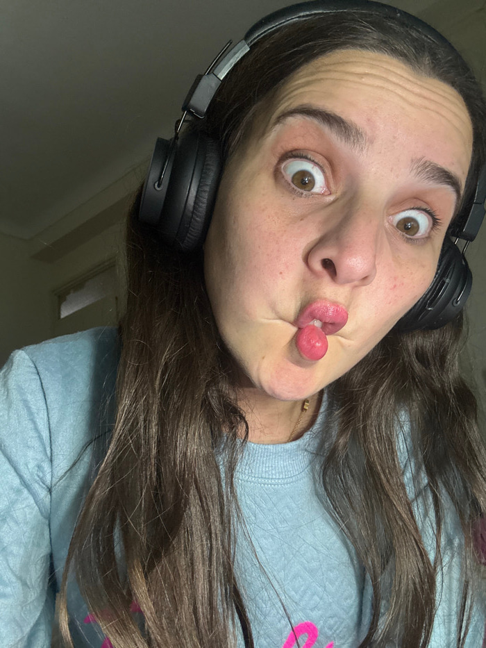 A young woman poses close to the camera with a distorted expression, pursing her lips into a "duck face" while her eyes are wide open. She is wearing black headphones and a light blue sweater. Her lon…read more