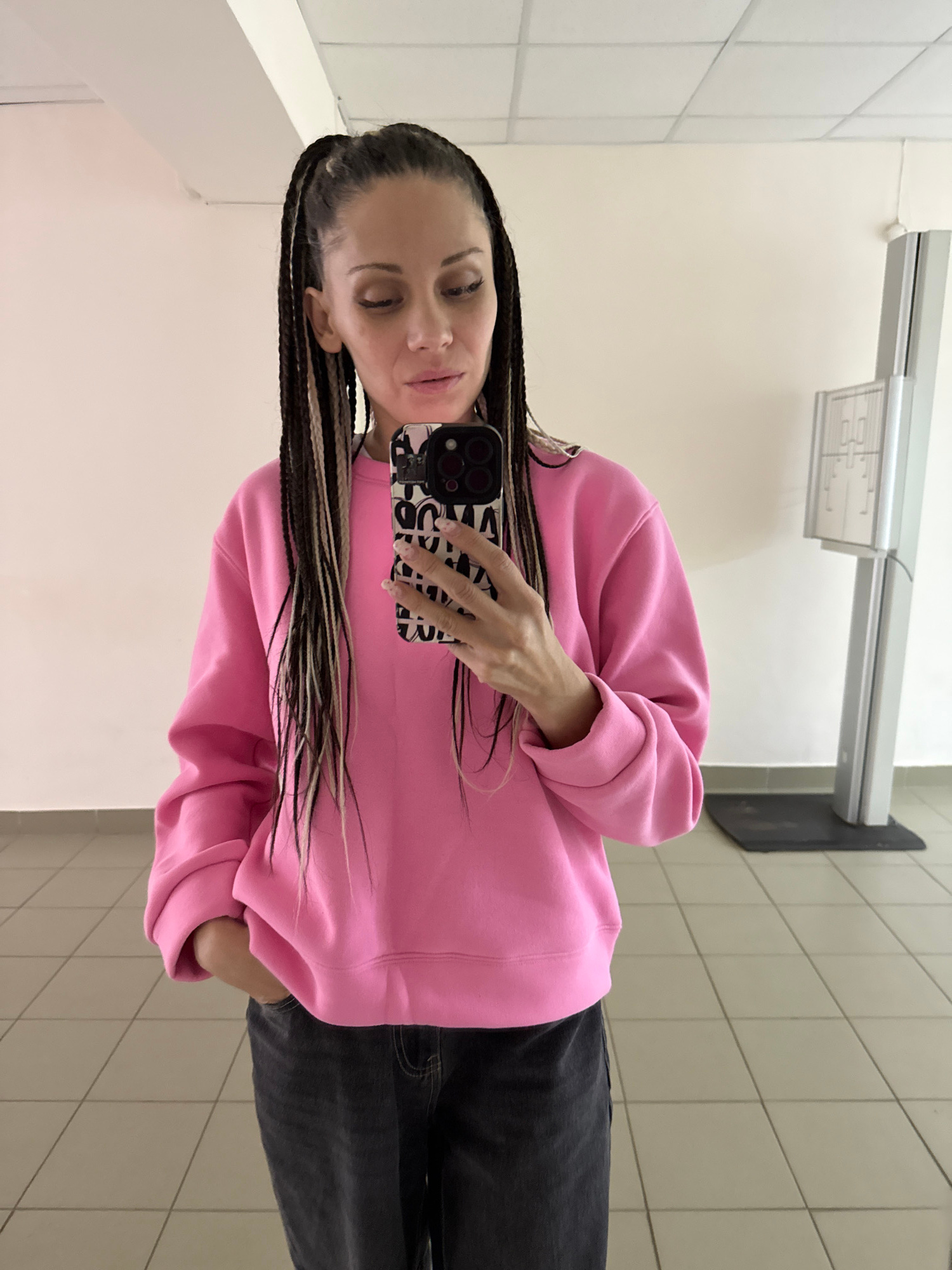 A woman is taking a selfie in what appears to be a public restroom. She's wearing a pink sweatshirt and dark-colored jeans. Her hair is styled in braids with blonde highlights. She is holding a smartpβ¦read more