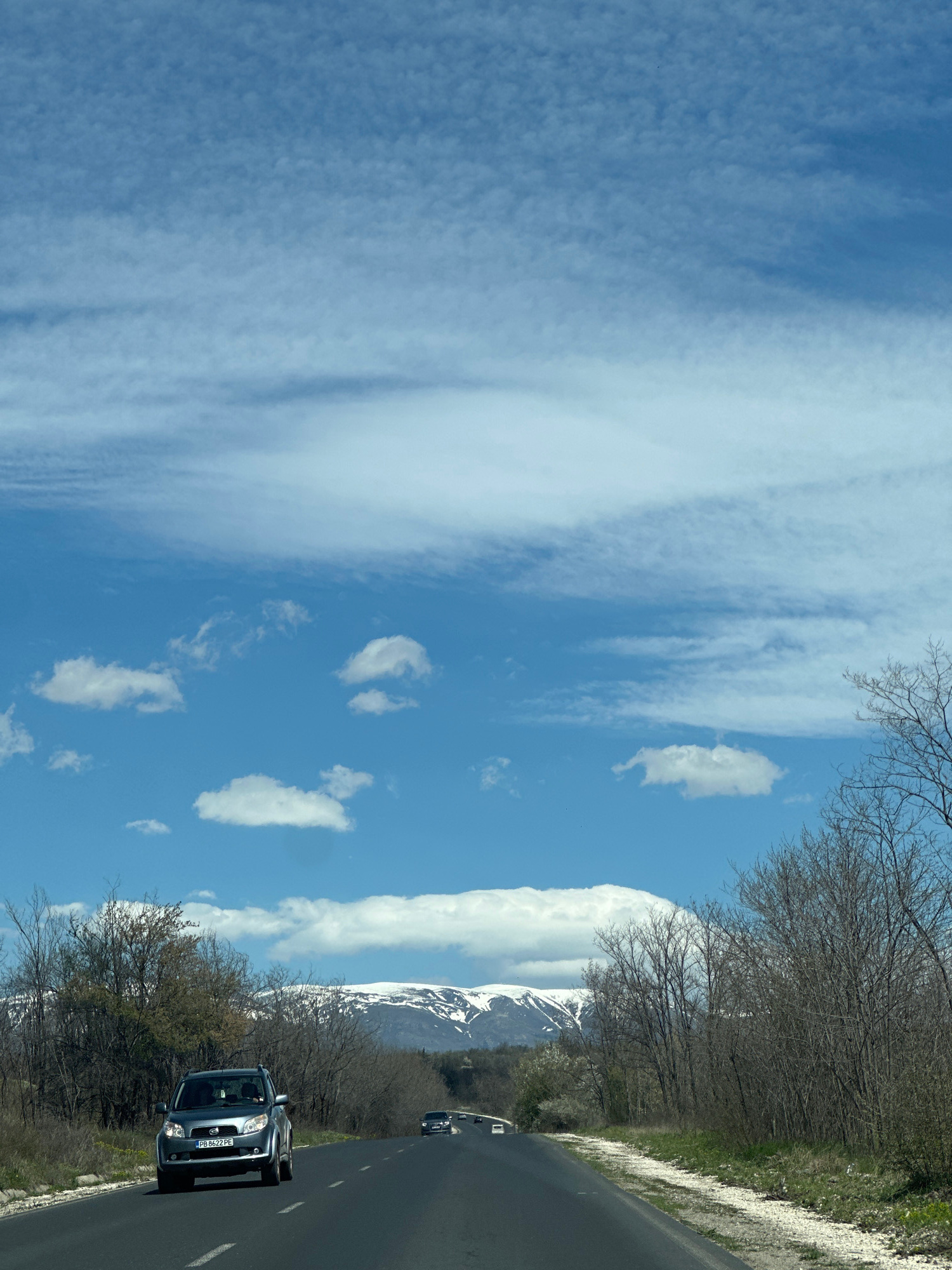 A sideways view shows a road winding in front of a mountain. In the foreground, a gray car drives on the right side of the road, with its license plate visible. Further ahead, another car is faintly v…read more
