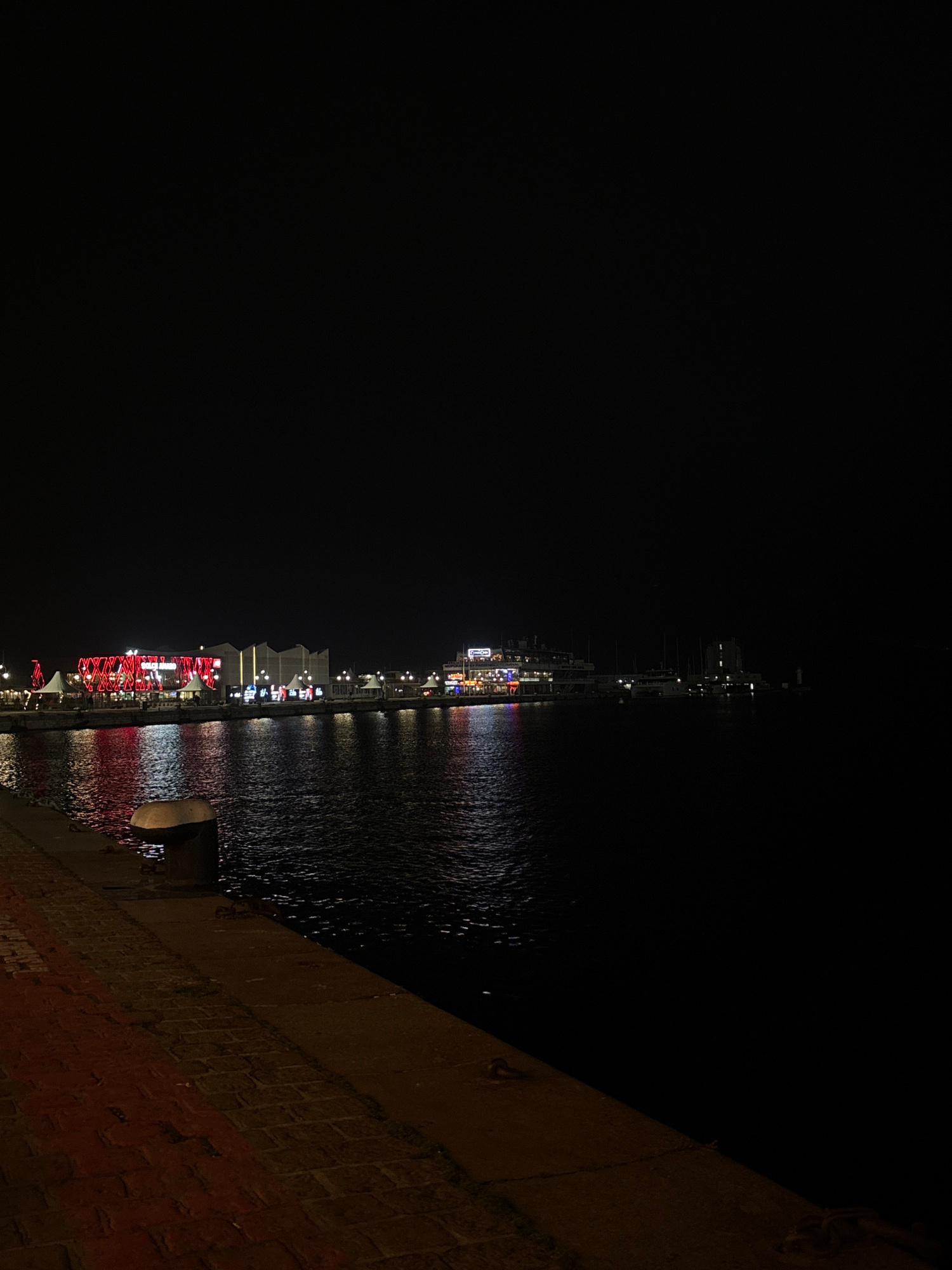 The image depicts a night scene in Varna, Bulgaria, showing a waterfront area. A concrete or brick wall runs along the right side of the image. To the left of the wall is a body of water, presumably t…read more