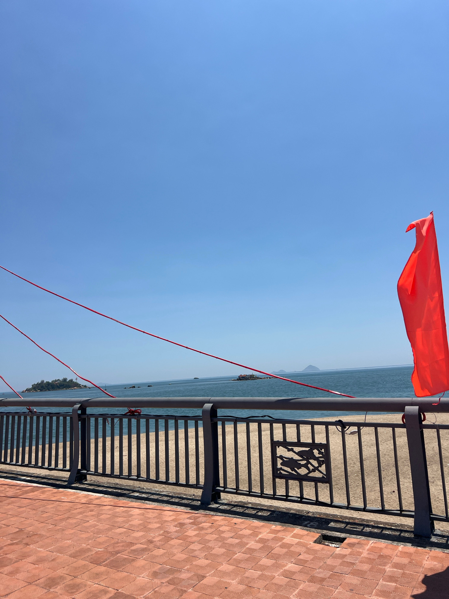 A landscape photograph captures a view along the coast in Nha Trang, Vietnam. The photo is vertically oriented, with a clear blue sky taking up the majority of the left side. Along the right, a black…read more