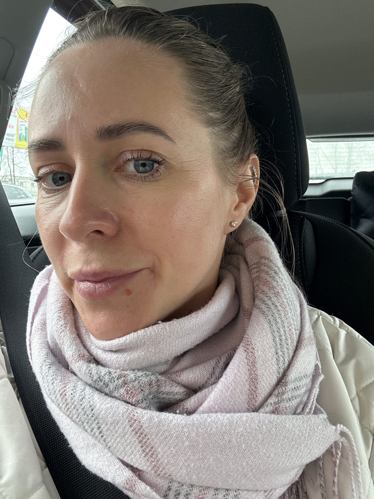 A woman with fair skin and blue eyes is the subject of this close-up, tilted image. She has light brown hair pulled back and is wearing a pale pink and grey scarf. She also has a small red mark near h…read more