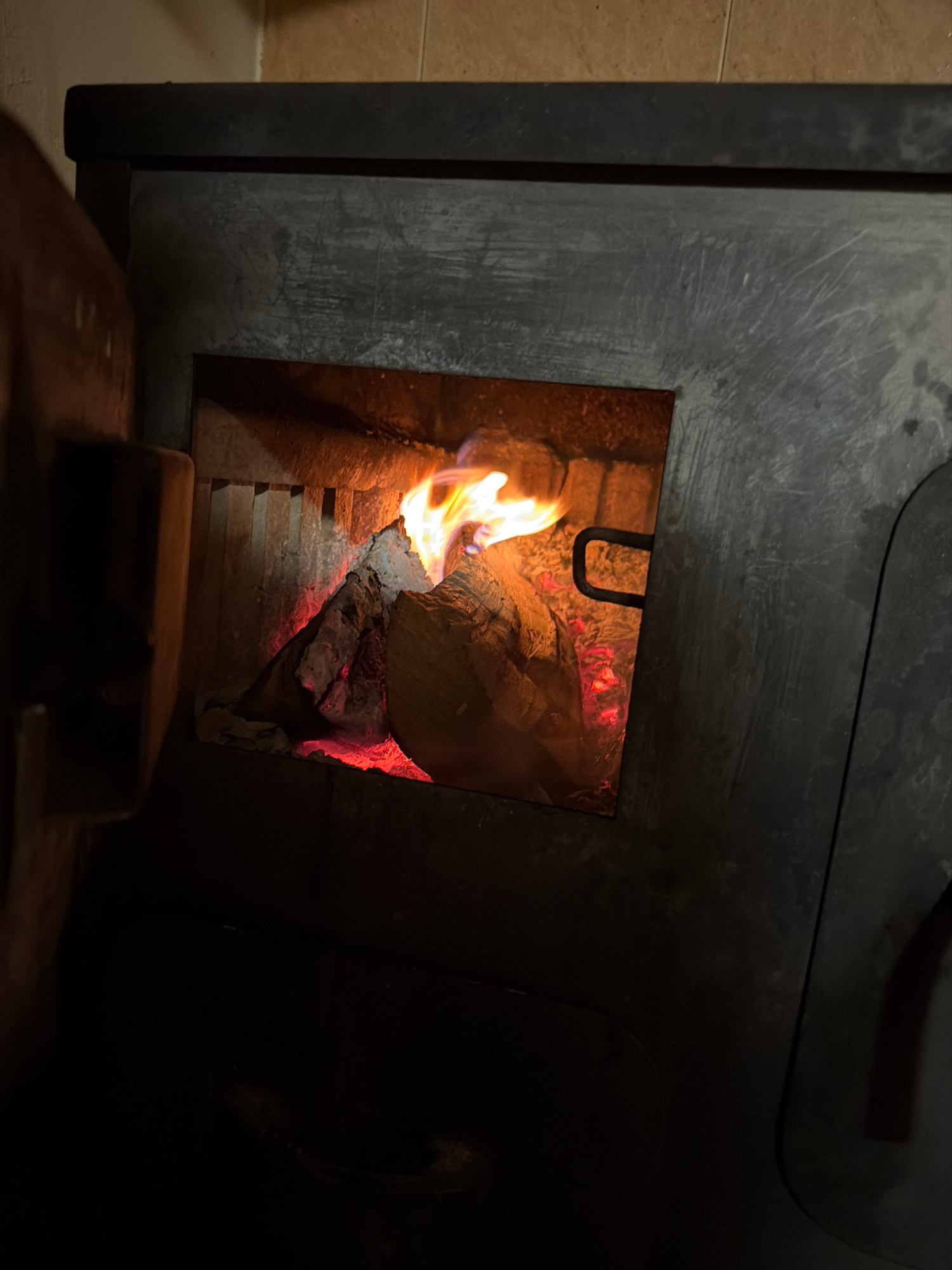 The image depicts the interior of a dark, likely cast-iron wood-burning stove. Within the firebox, flames are visible, consuming logs. The firebox floor appears to be lined with firebricks. The stove'…read more