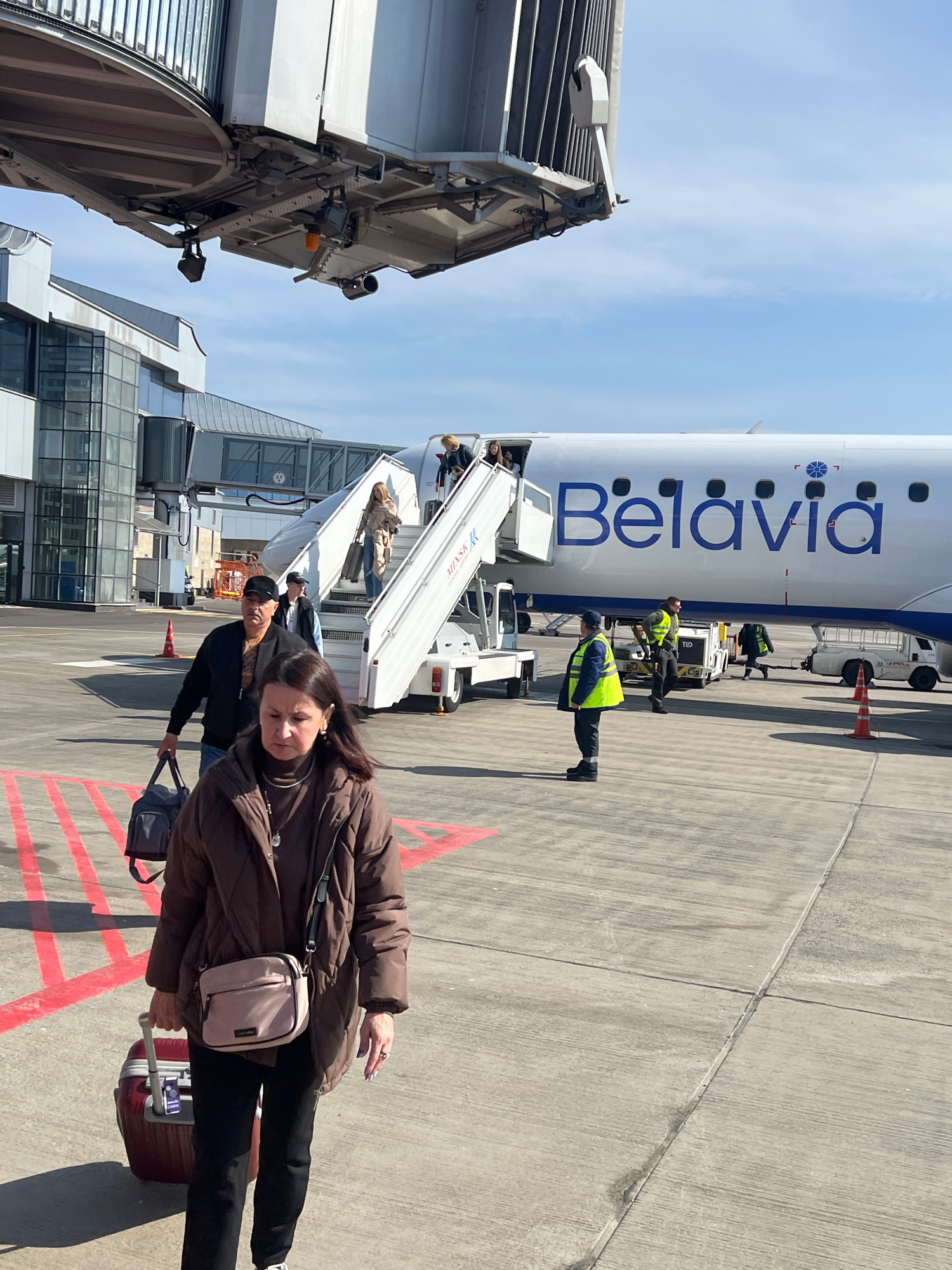 A medium shot taken on a sunny day at the Драчкаўскі сельскі Савет airport in Belarus shows a woman in a brown jacket walking on the tarmac with a red suitcase, in front of a Belavia airplane with wor…read more