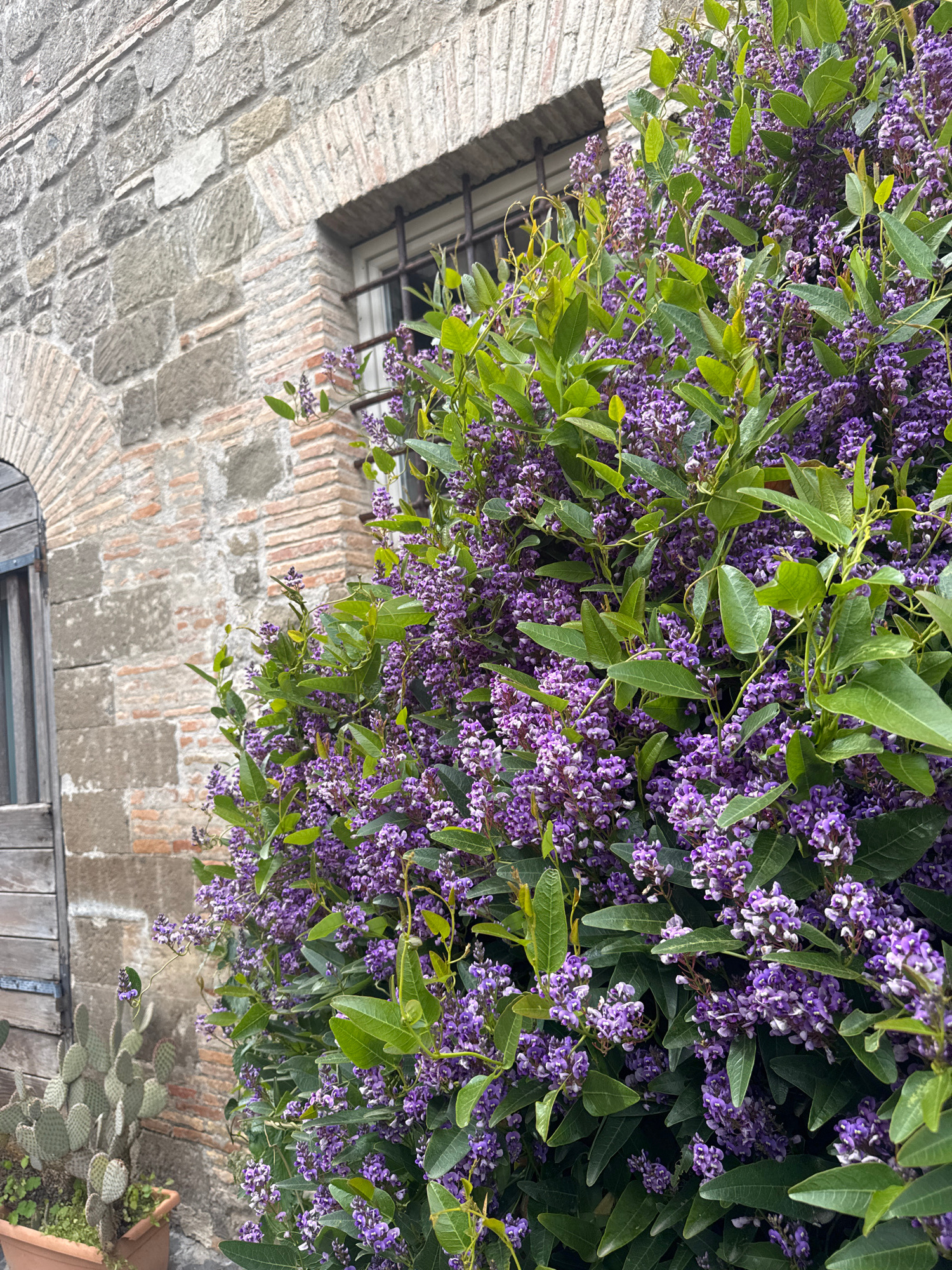 A medium shot taken in Castelnuovo di Porto, Italy, shows a stone archway with a small, barred window set into it. Overhanging this archway is a mass of blooming wisteria or similar flowering vine wit…read more