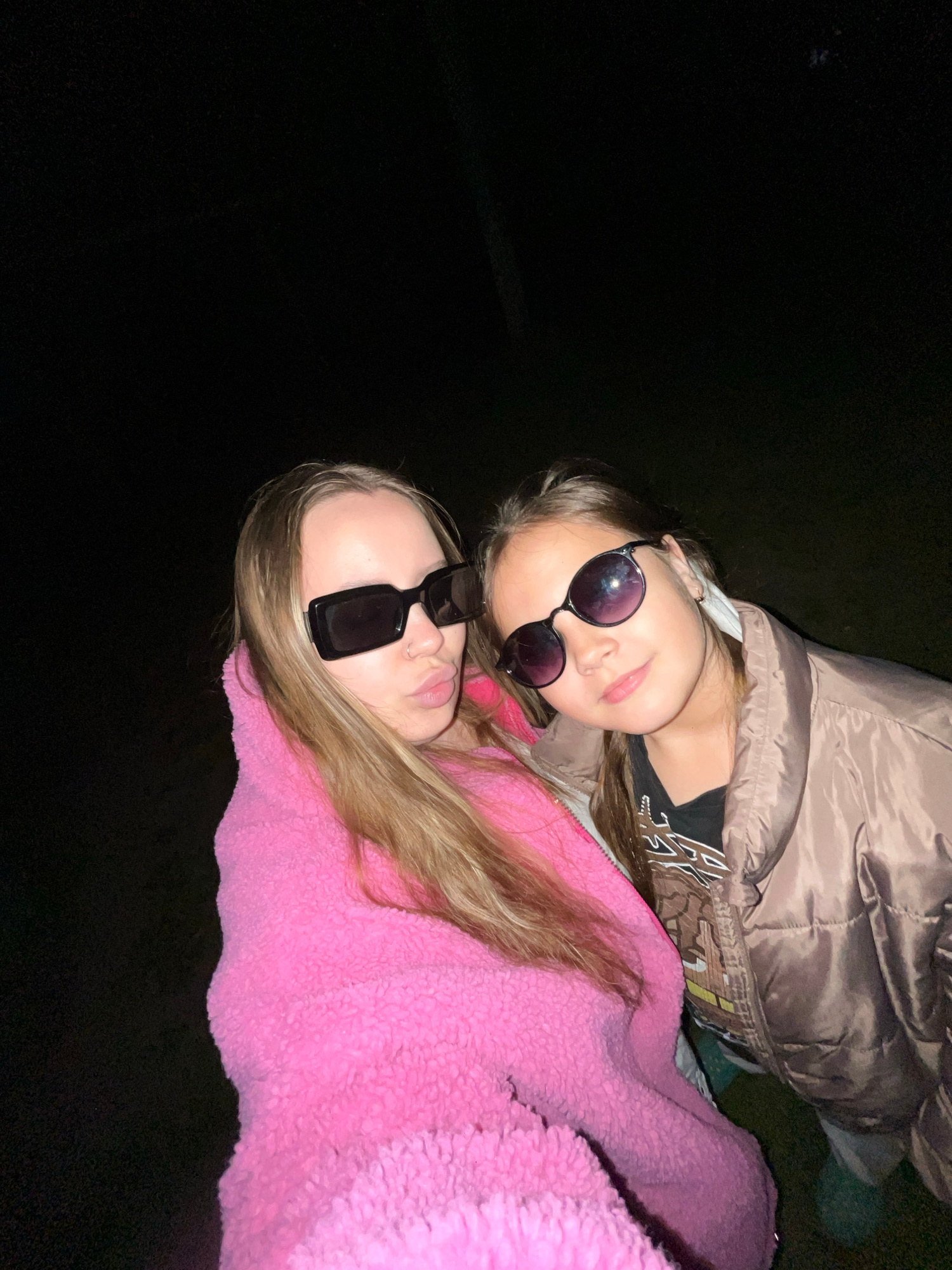 Two young girls are lying down close together in a dark environment. The girl in the foreground wears a pink, textured jacket and black, rectangular sunglasses. Her blonde hair is partially visible. T…read more