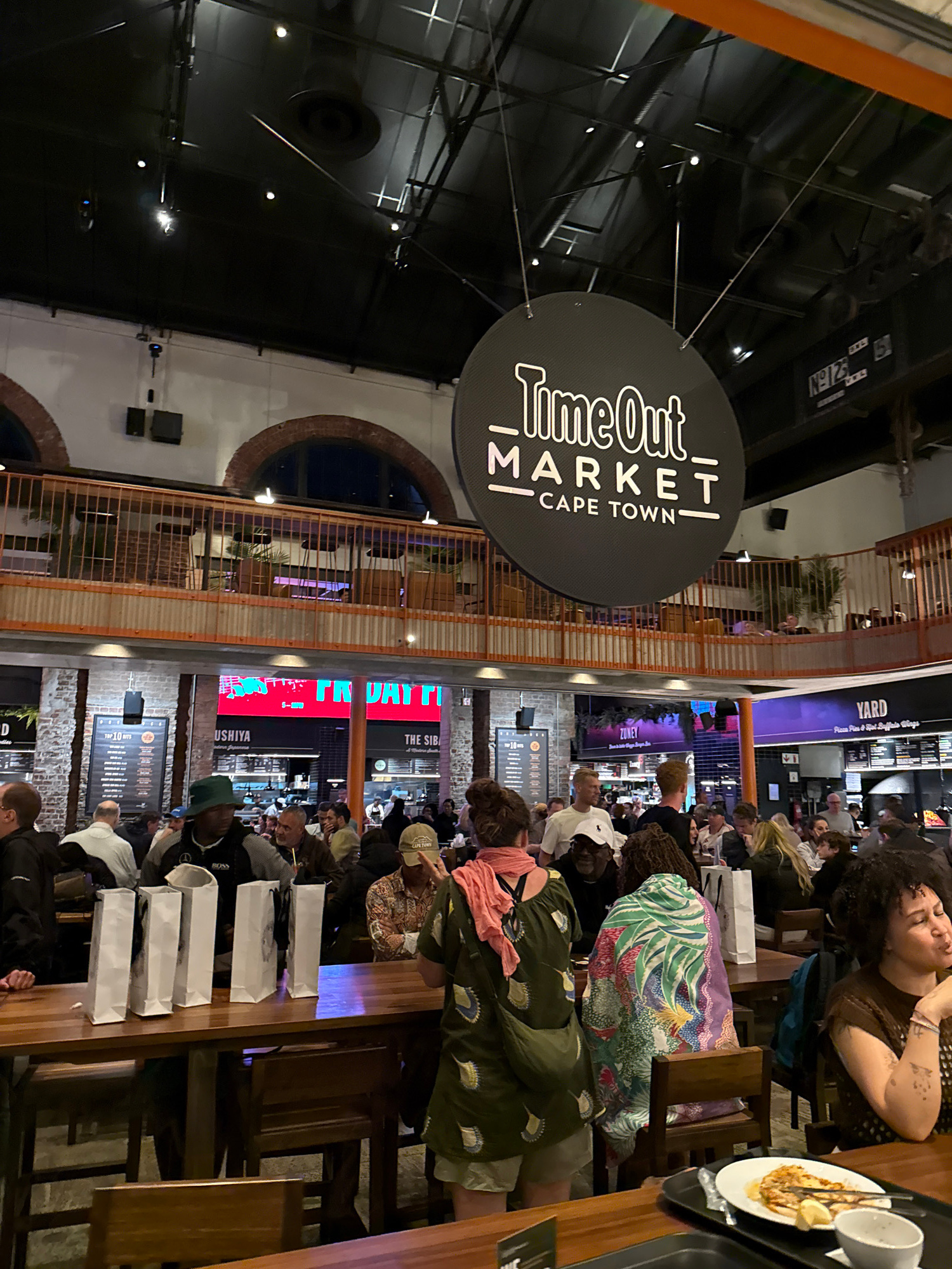 The image shows the interior of the Time Out Market in Cape Town, South Africa. A large, circular sign with the "Time Out Market" logo hangs from the ceiling. The market is a multi-level establishment…read more
