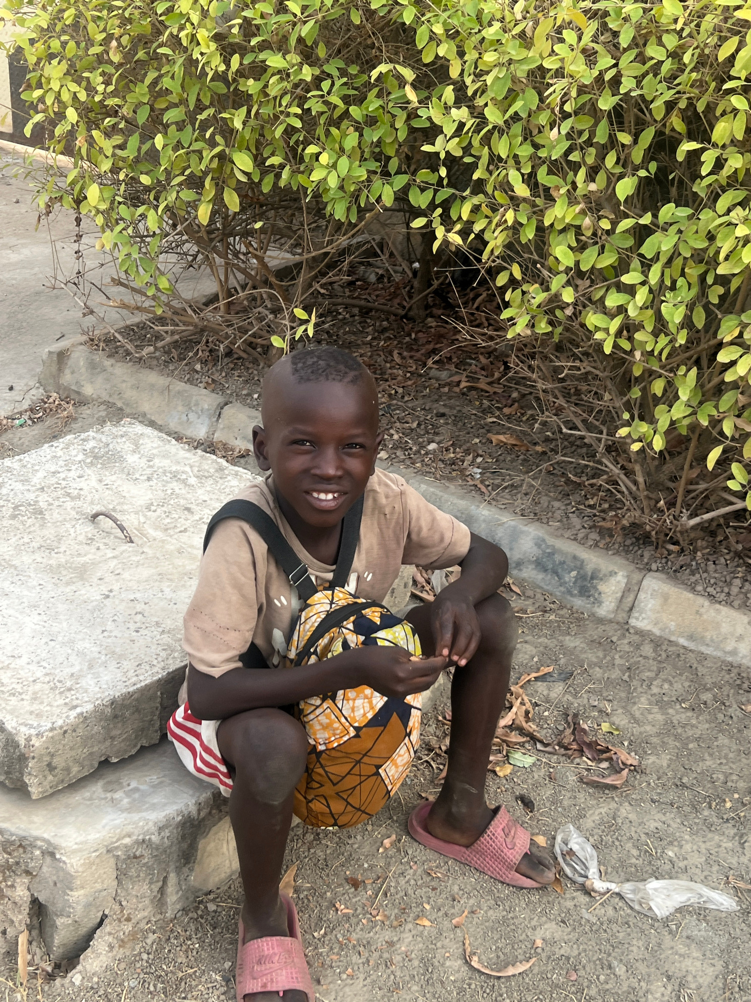 A young boy sits on a concrete block in Minna, Nigeria. He is dark-skinned, with short hair, wearing a beige t-shirt and red and white striped shorts. He has a satchel-like bag on his shoulder. He wears pink flip-flops. He smiles, looking up at the camera. Beside him is a green leafy bush. The ground is dirt and gravel with some trash. | Open Wire