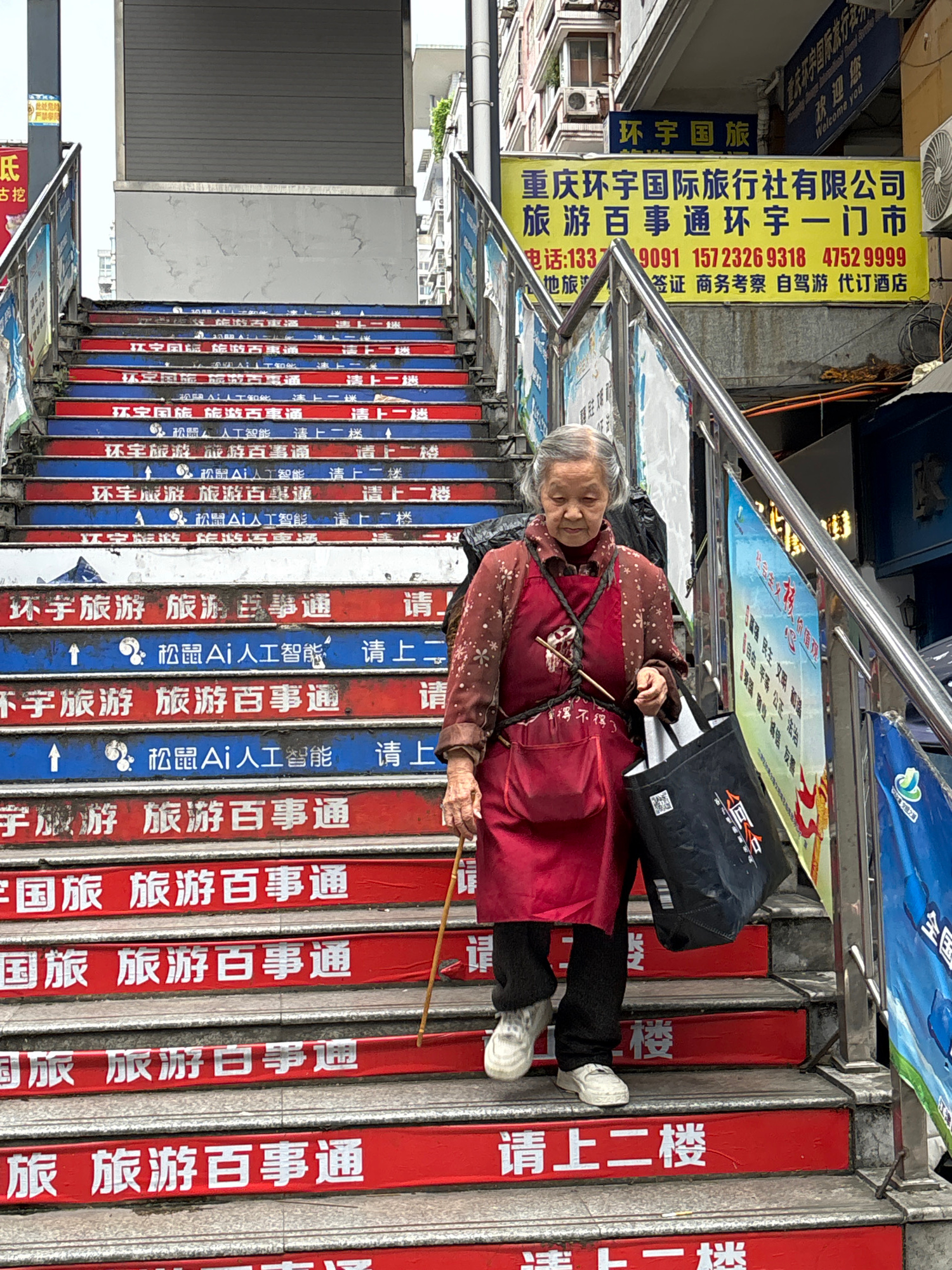 The image shows an elderly woman in Jiangjin, China, ascending a set of stairs. She is dressed in a red tunic over a patterned brown blouse, black pants, and white sneakers. She carries a black bag ov…read more