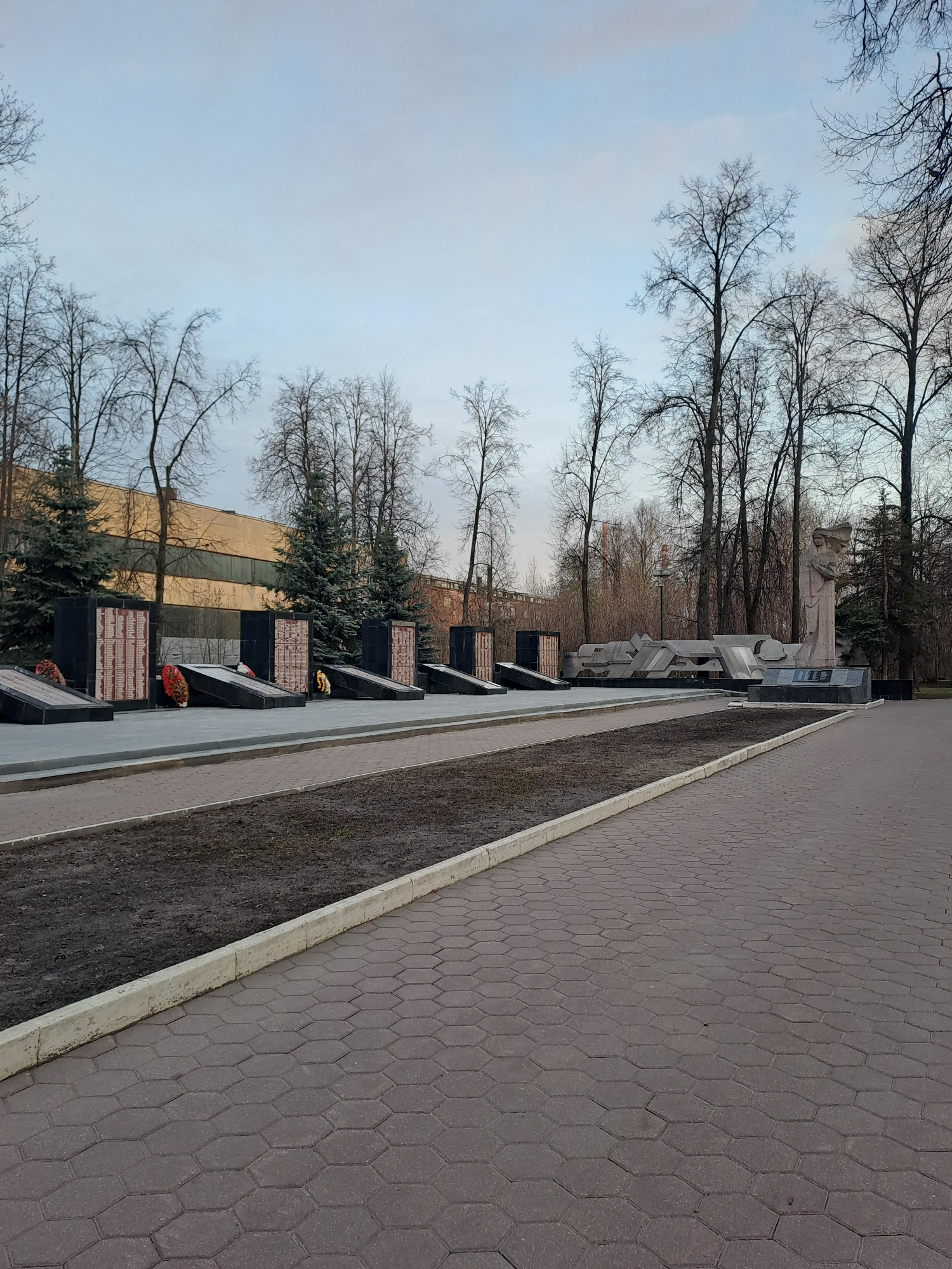 This image depicts a section of the Glory Alley Memorial in Elektrostal, Russia. The memorial consists of a paved walkway lined with black granite plaques, each bearing inscriptions (possibly names or…read more