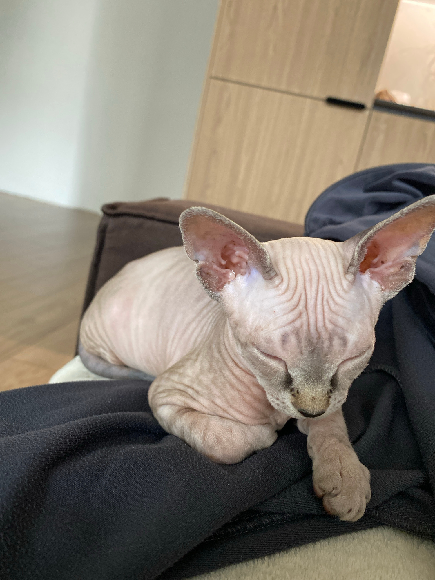 A hairless cat, likely a Sphynx breed, is resting on a dark gray fabric. The cat is light pink with gray markings on its head and paws. Its eyes are closed. The cat's wrinkled skin is visible. The bac…read more