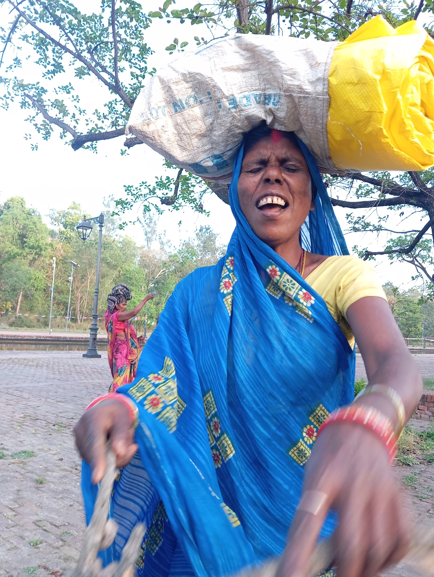 The image depicts two adult females in an outdoor setting identified as Parsa, Nepal. In the foreground, an adult woman is captured with her eyes closed and mouth open, revealing her upper teeth. She…read more