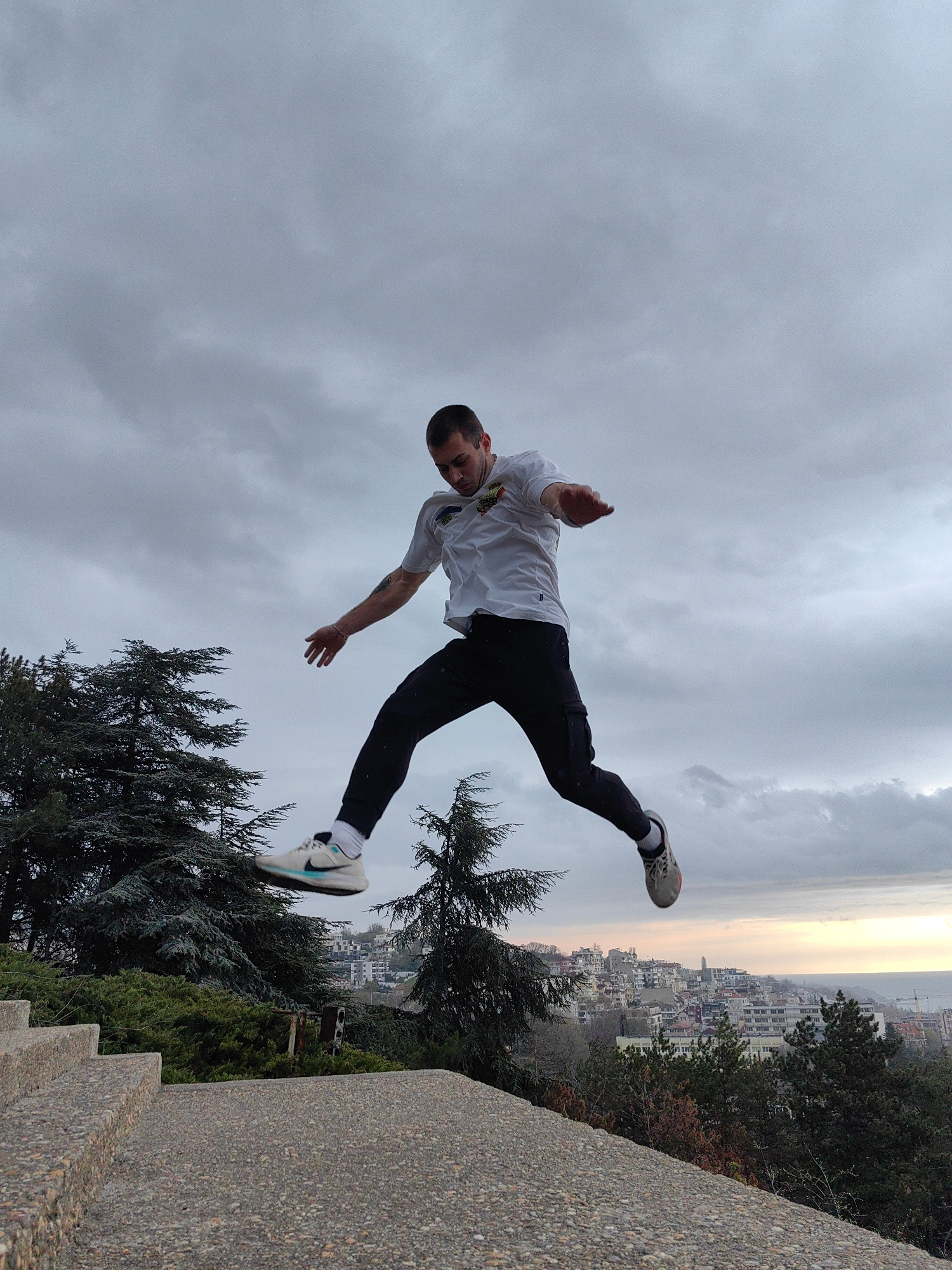A full-length shot captures a man mid-jump against a cloudy sky. The man is wearing a white t-shirt, black pants, and sneakers. He is positioned in mid-air, seemingly leaping from a concrete surface a…read more