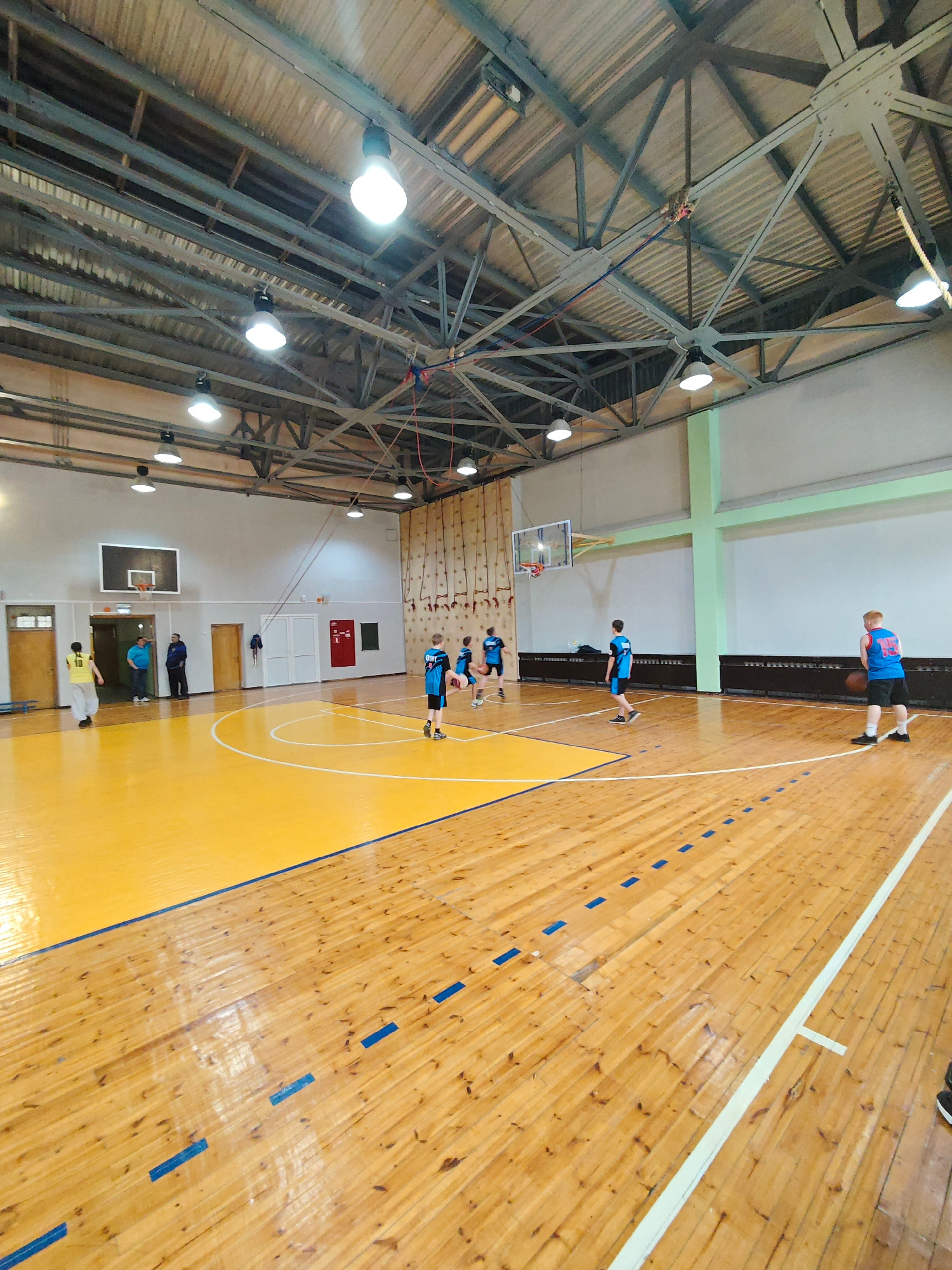 The image shows a basketball game in progress within an indoor gymnasium in Markovskii, Russia. Players wearing blue and black jerseys are actively engaged in the game. A player in a yellow jersey sta…read more