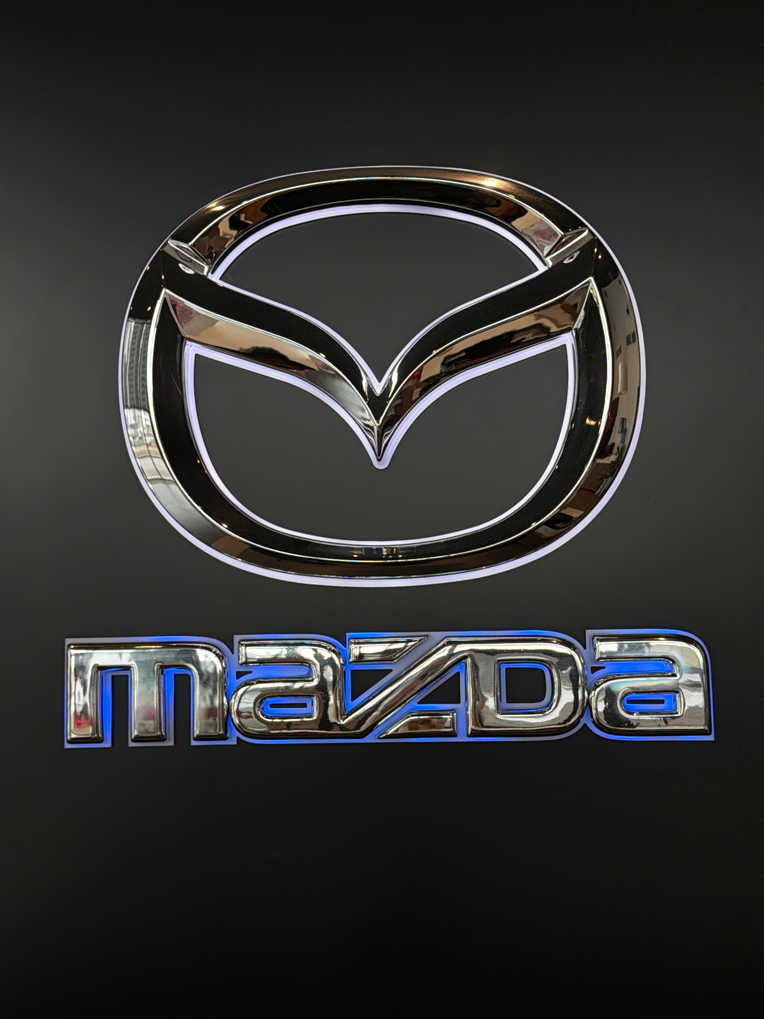 The image shows the Mazda logo and name against a black background. The logo, a stylized "M" inside a circle, is silver with a reflective surface. The name "Mazda" is displayed vertically in silver le…read more