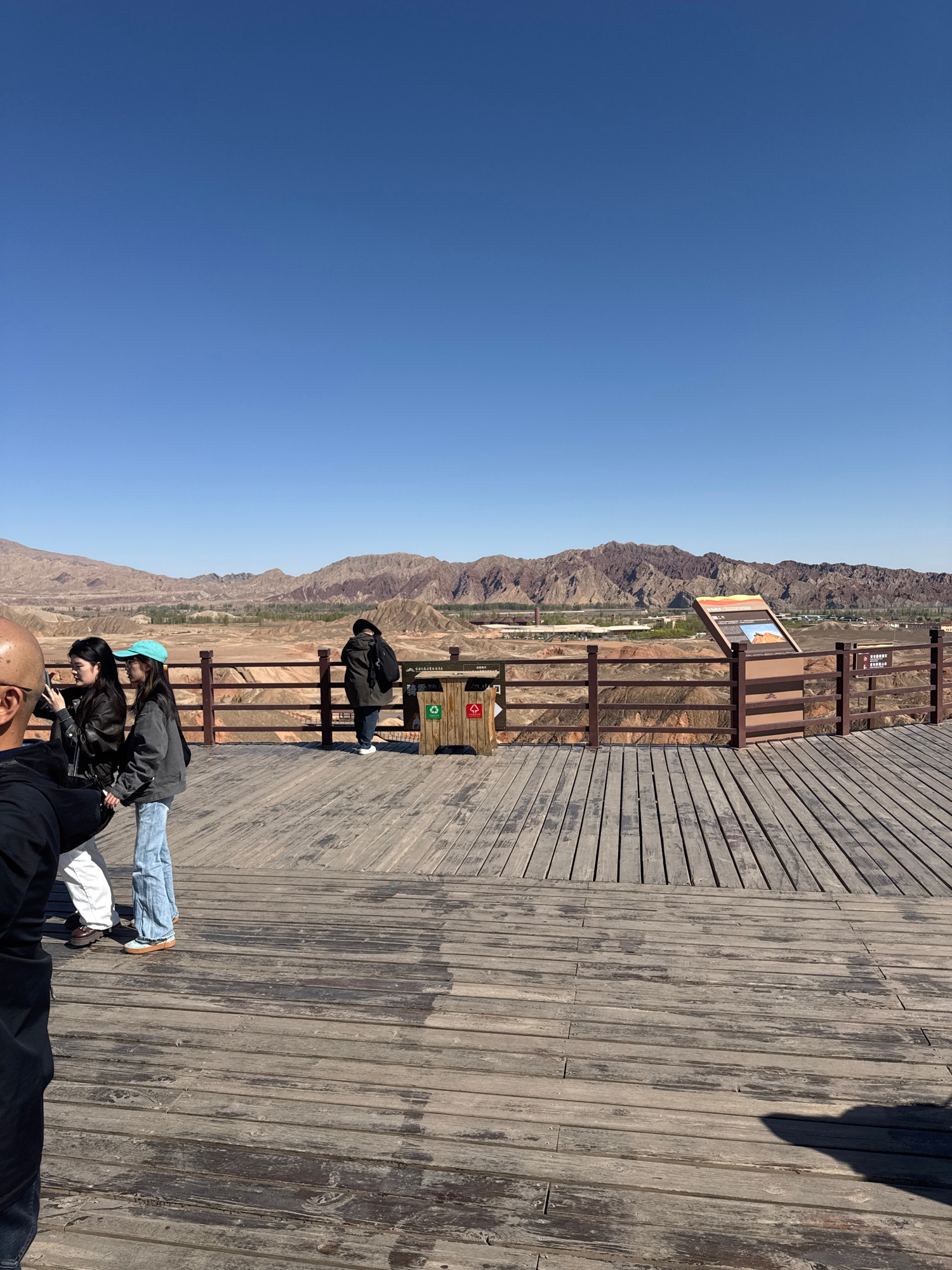 The image displays a scenic overlook in Zhangye, China, showcasing the vast, undulating Danxia landforms under a clear, bright blue sky. A robust wooden boardwalk occupies the foreground and mid-groun…read more