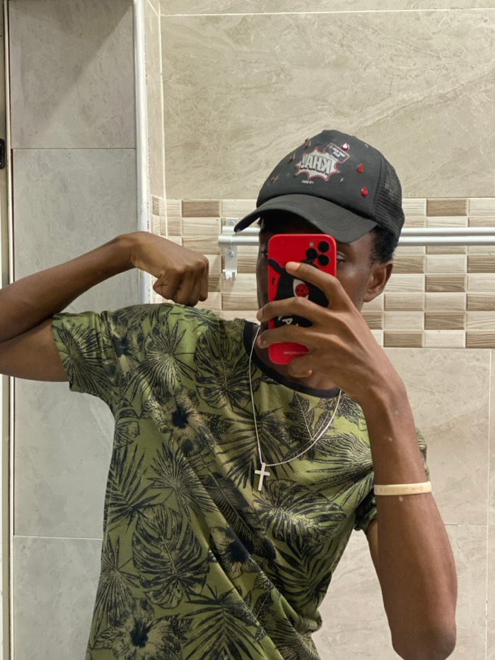 An individual, appearing male with dark skin, is depicted indoors, likely in a room with light-colored, rectangular tiled walls. The subject is taking a mirror selfie, holding a red smartphone with a…read more