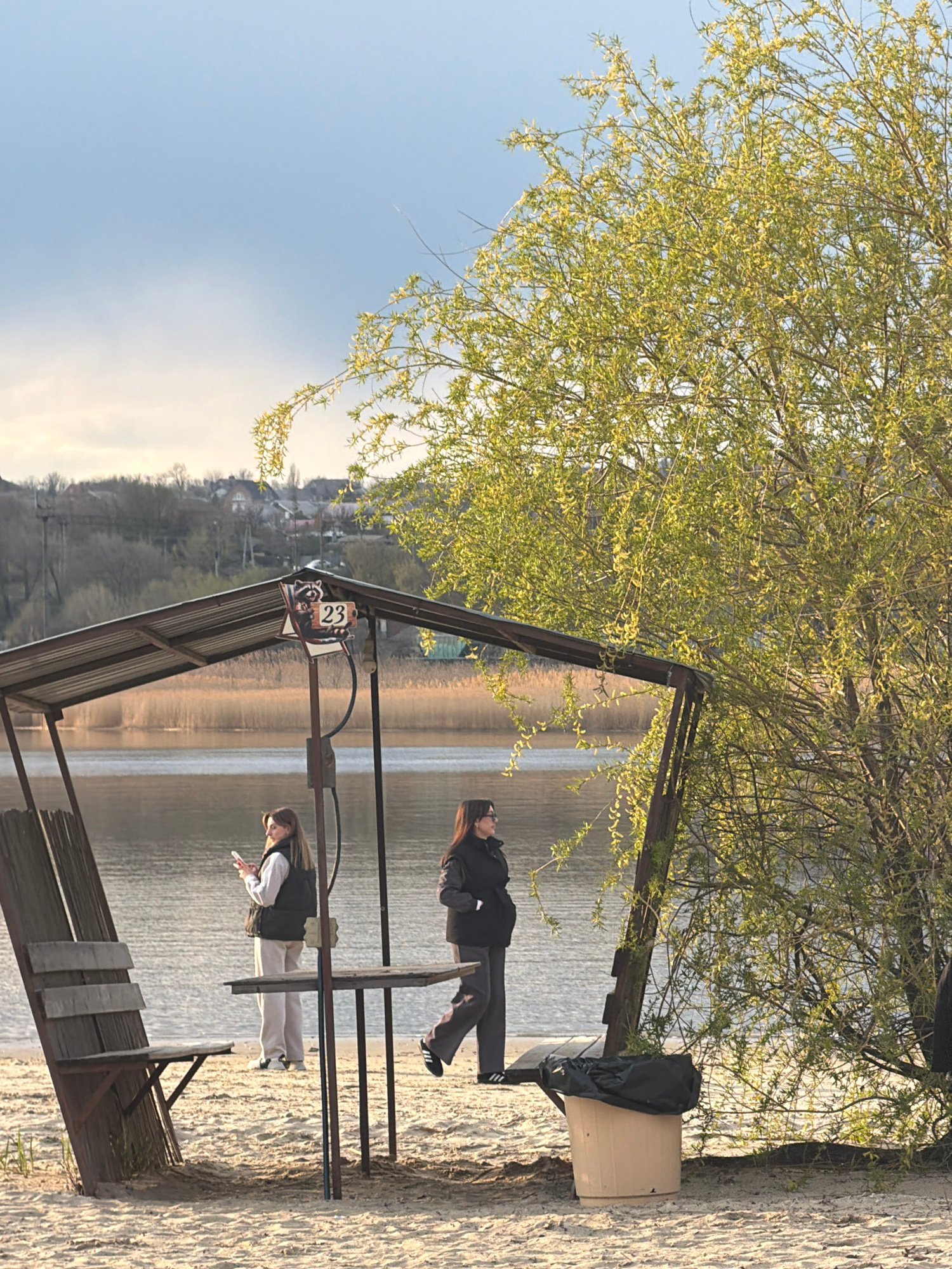 The scene is captured on a sunny day near a body of water, possibly a lake or a wide river, in Olginskaya, Russia. The image includes a man and a woman standing at the edge of the water, with a struct…read more