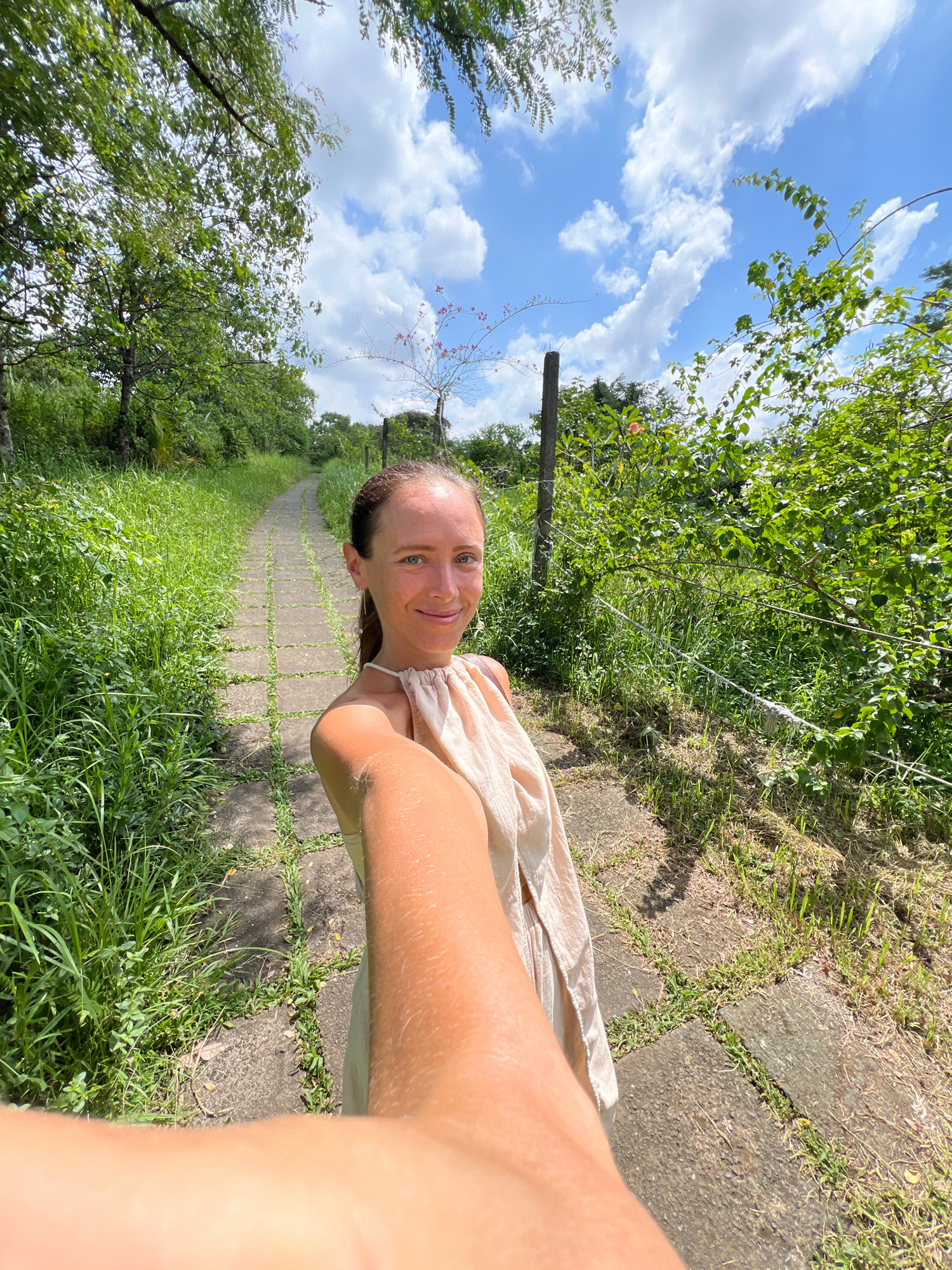 A woman is taking a selfie while standing on a brick path in Ubud, Indonesia. The path stretches into the distance between grassy areas and trees under a blue sky with puffy white clouds. The woman is…read more